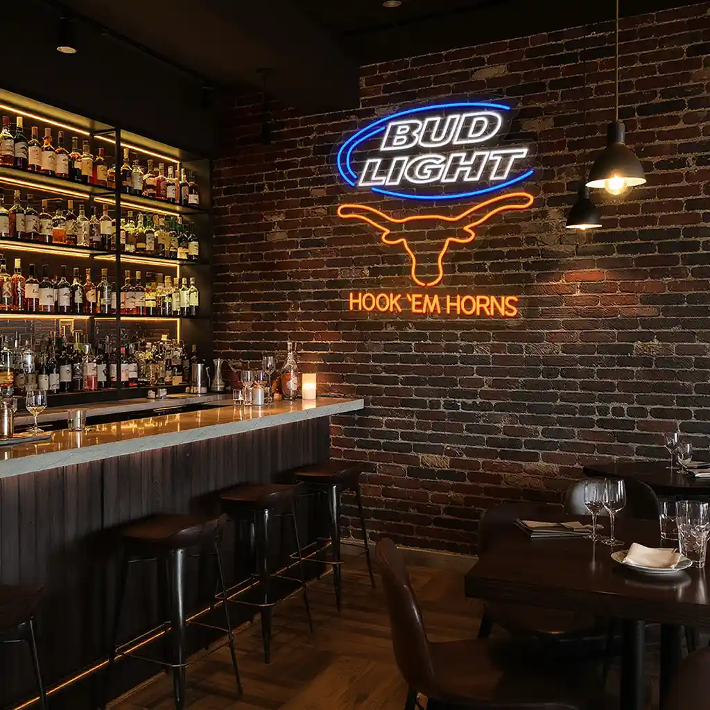 The Neon Bar Sign: Bud Light Hook ‘Em Horns – Unique Design features a vibrant, eye-catching display that combines classic Bud Light branding with the iconic Hook ‘Em Horns hand gesture. This neon sign is perfect for adding a spirited and lively atmosphere to any bar, man cave, or entertainment space.