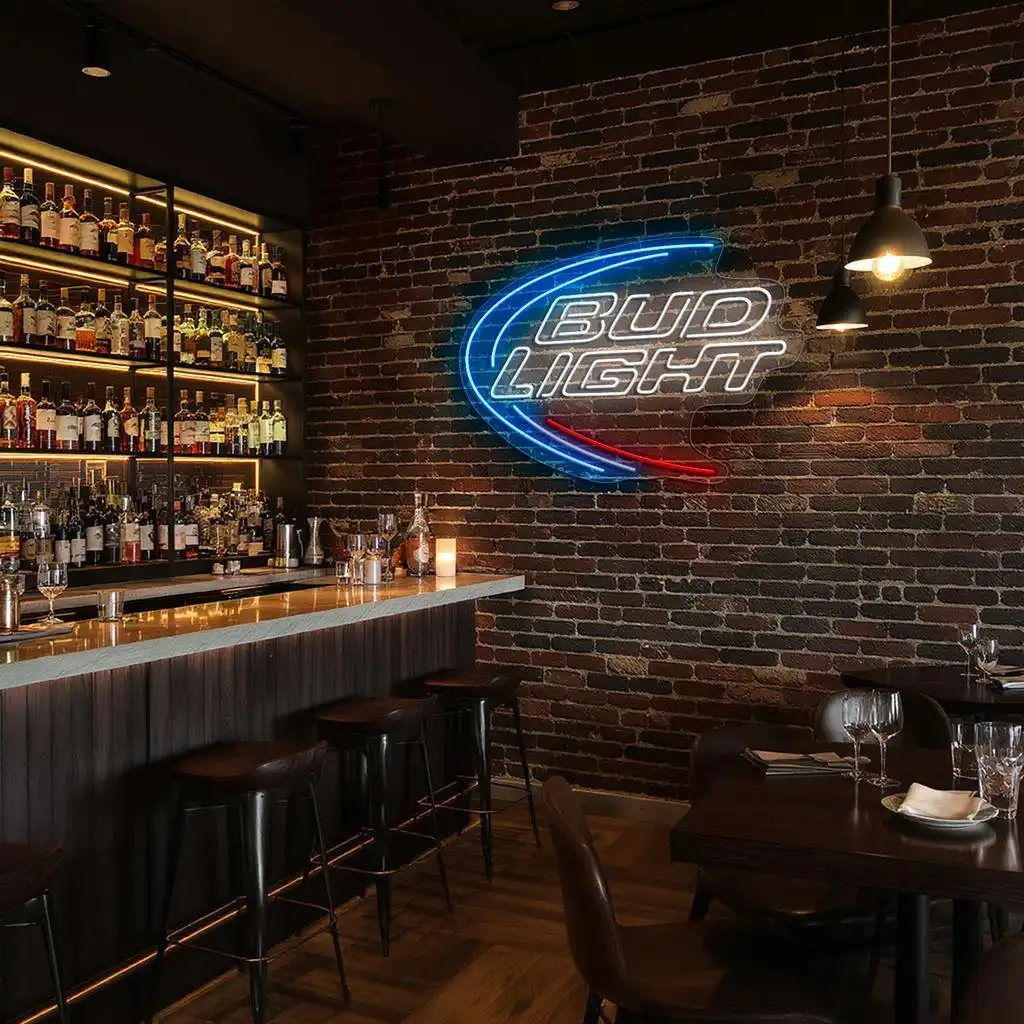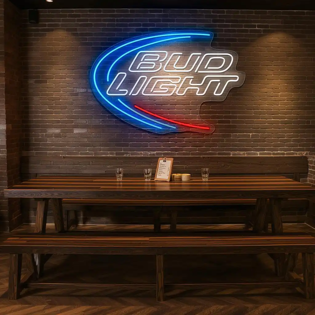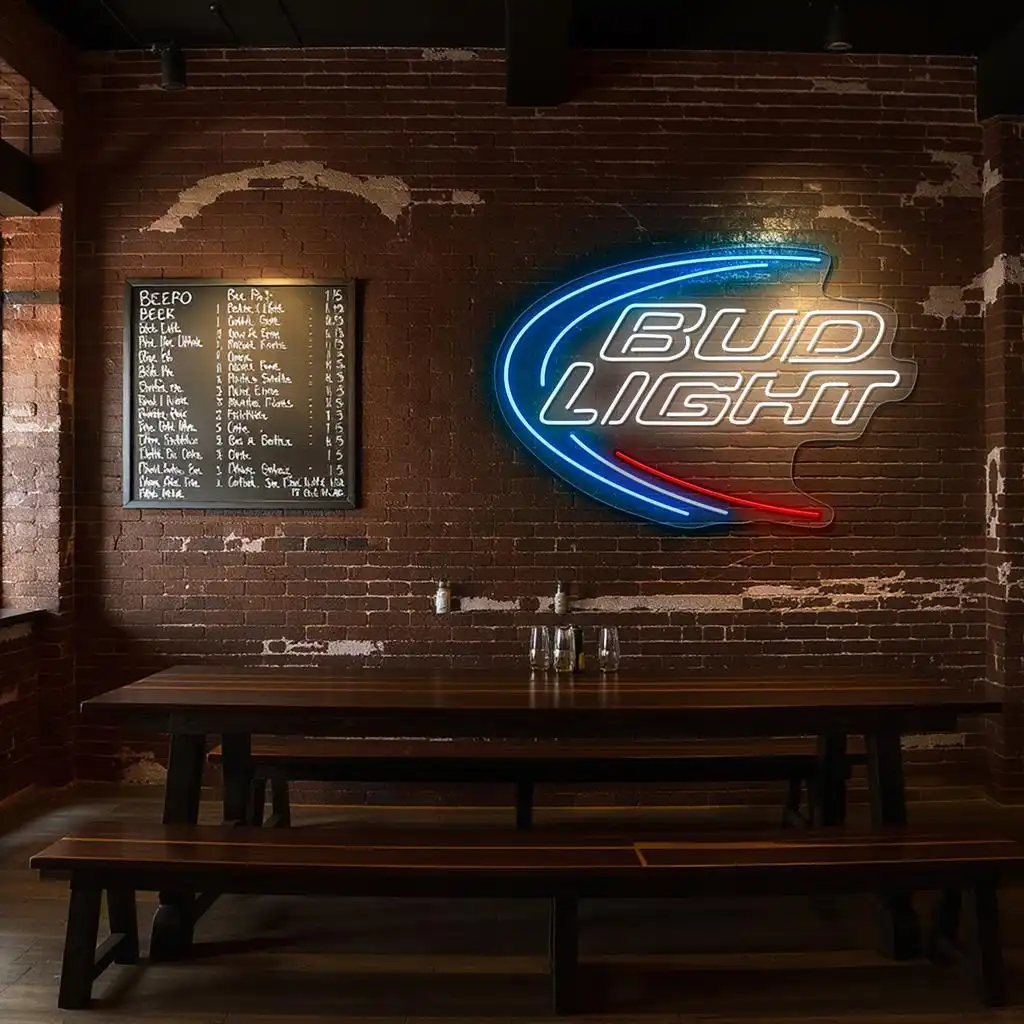 - Vivid Color Coordination: The primary blue neon arcs highlight the sign’s outer curve, inviting attention and creating a sense of motion, while the crisp white neon outlines the “Bud Light” text for maximum legibility and brightness.