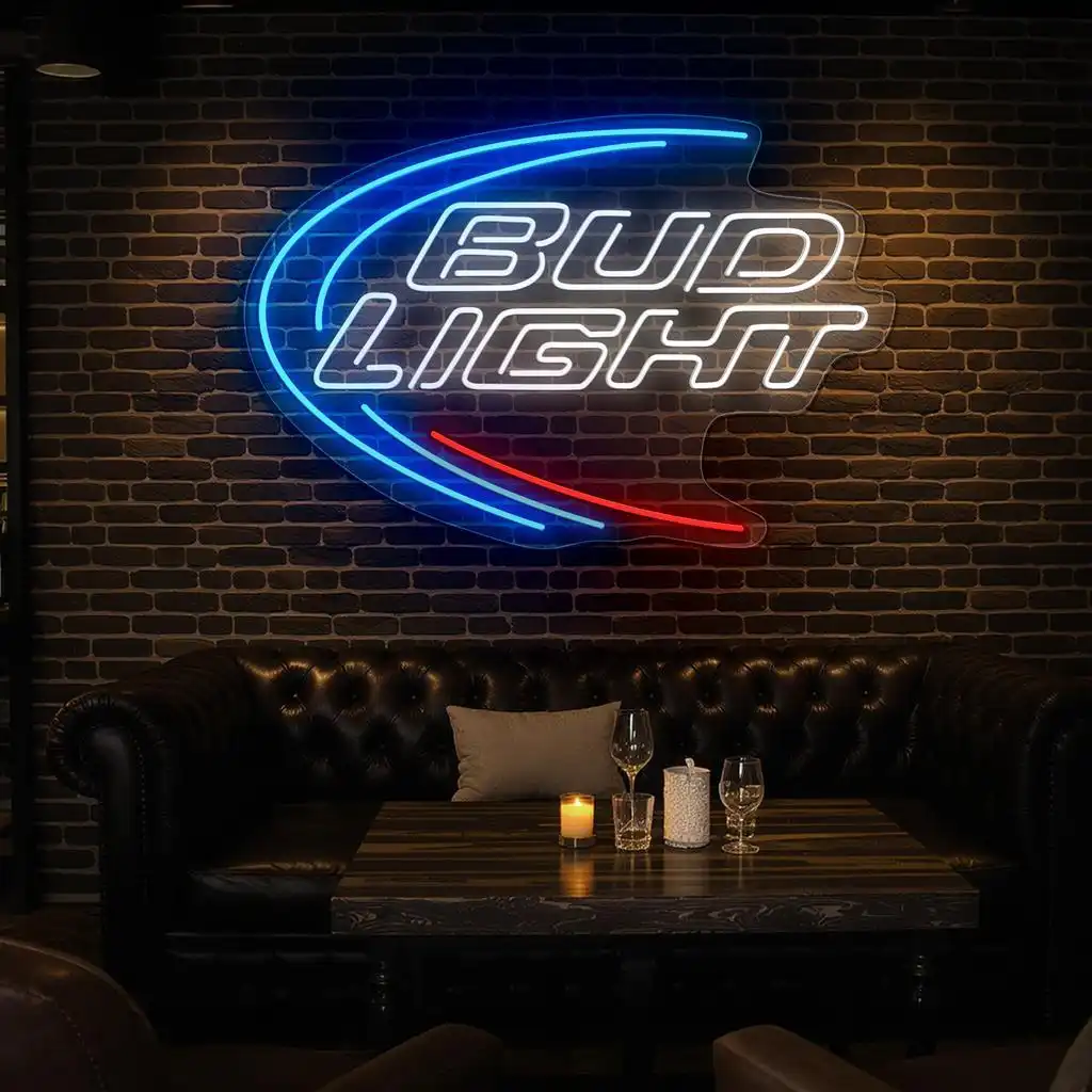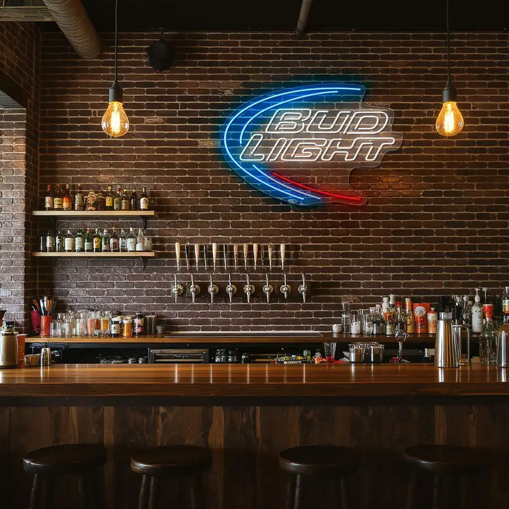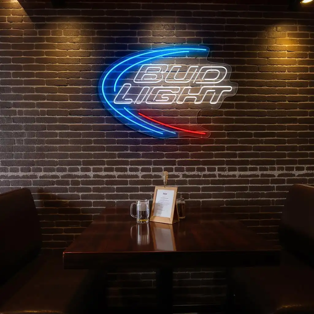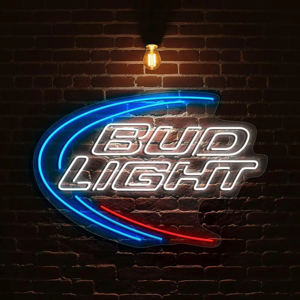 - Vivid Color Coordination: The primary blue neon arcs highlight the sign’s outer curve, inviting attention and creating a sense of motion, while the crisp white neon outlines the “Bud Light” text for maximum legibility and brightness.