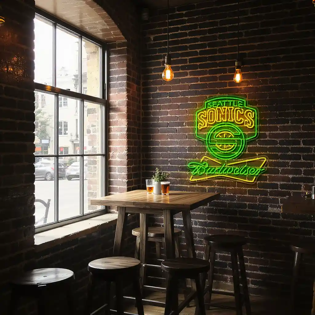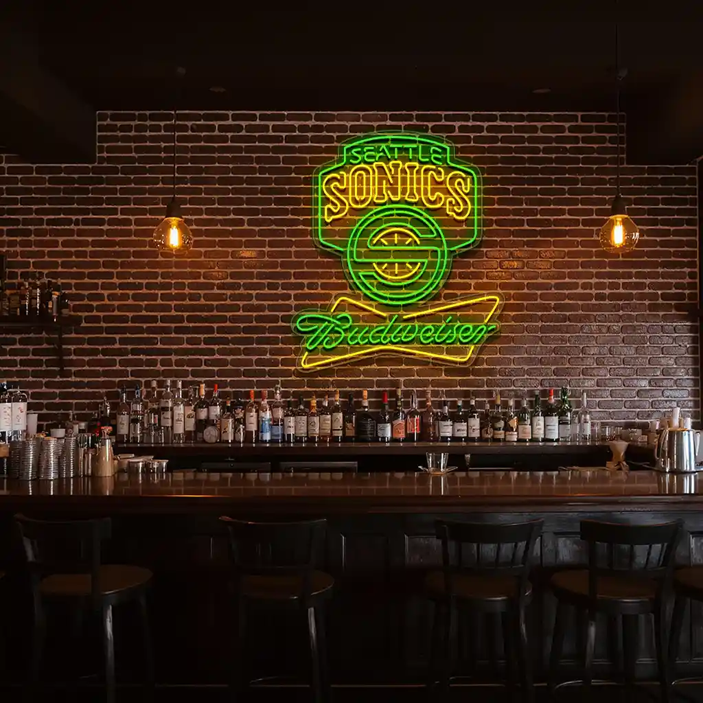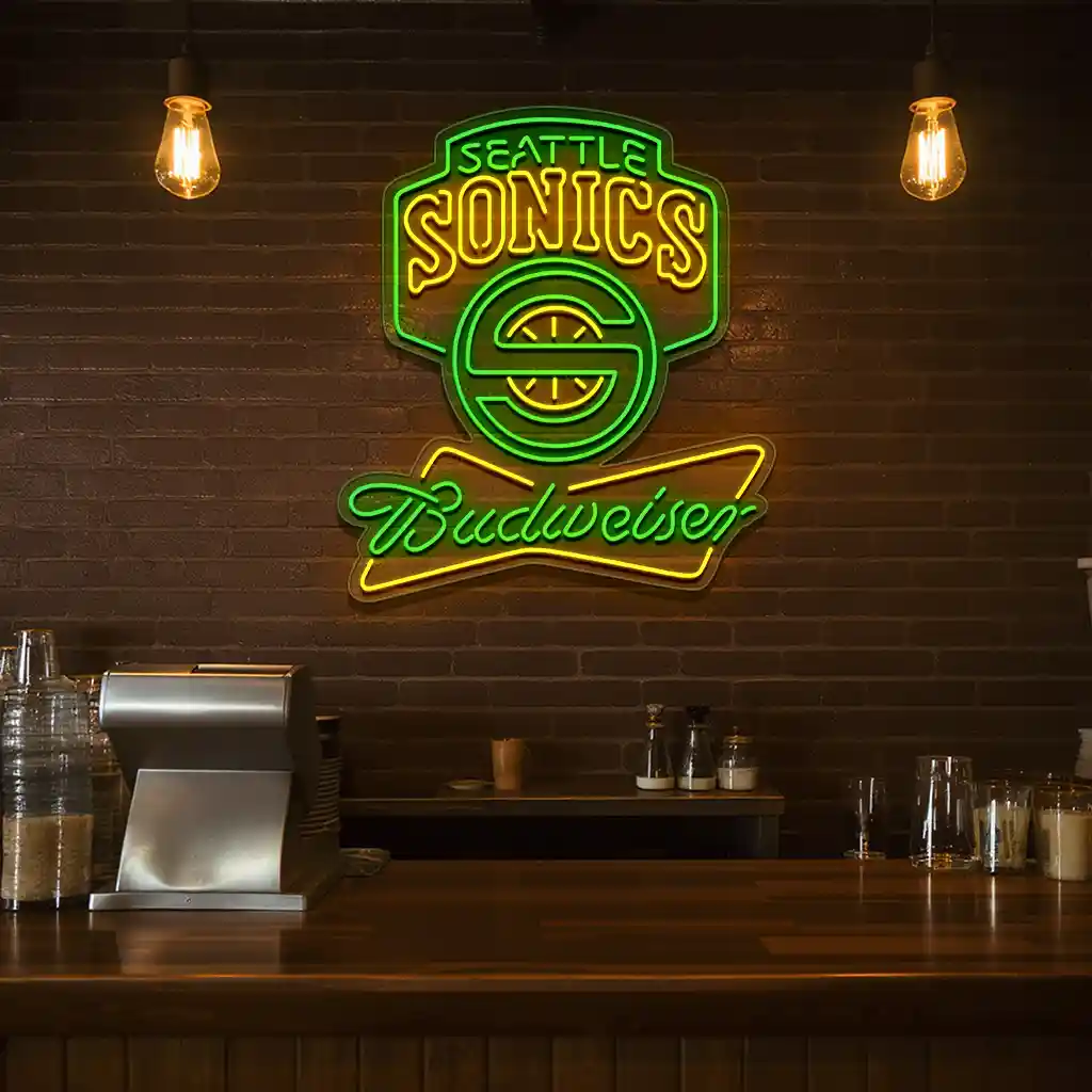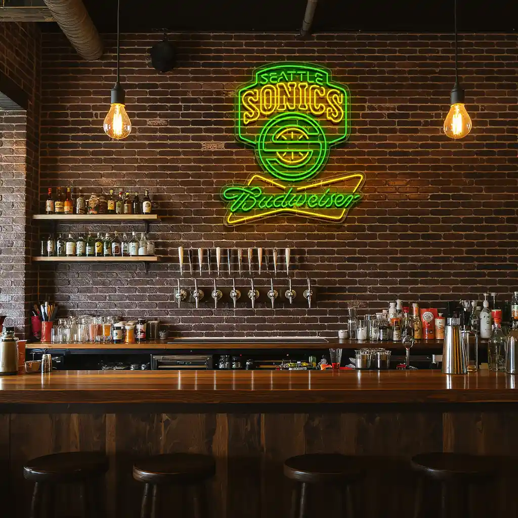 - Vivid Color Coordination: The neon sign features a striking mix of electric blue and bold red hues, representing the Seattle basketball team’s spirit while complementing Budweiser’s signature red branding. The harmonious color palette ensures high visibility and an inviting glow that draws attention from across the room.