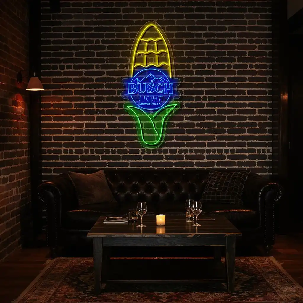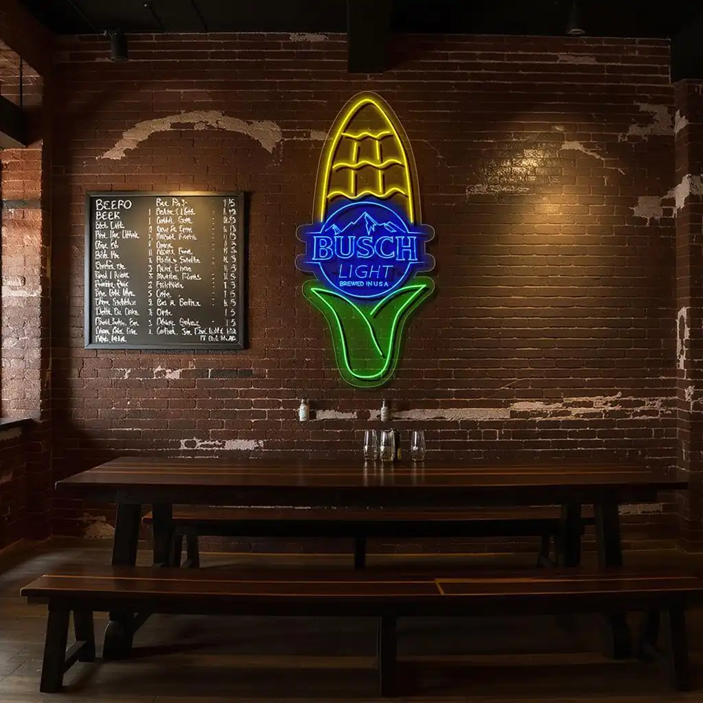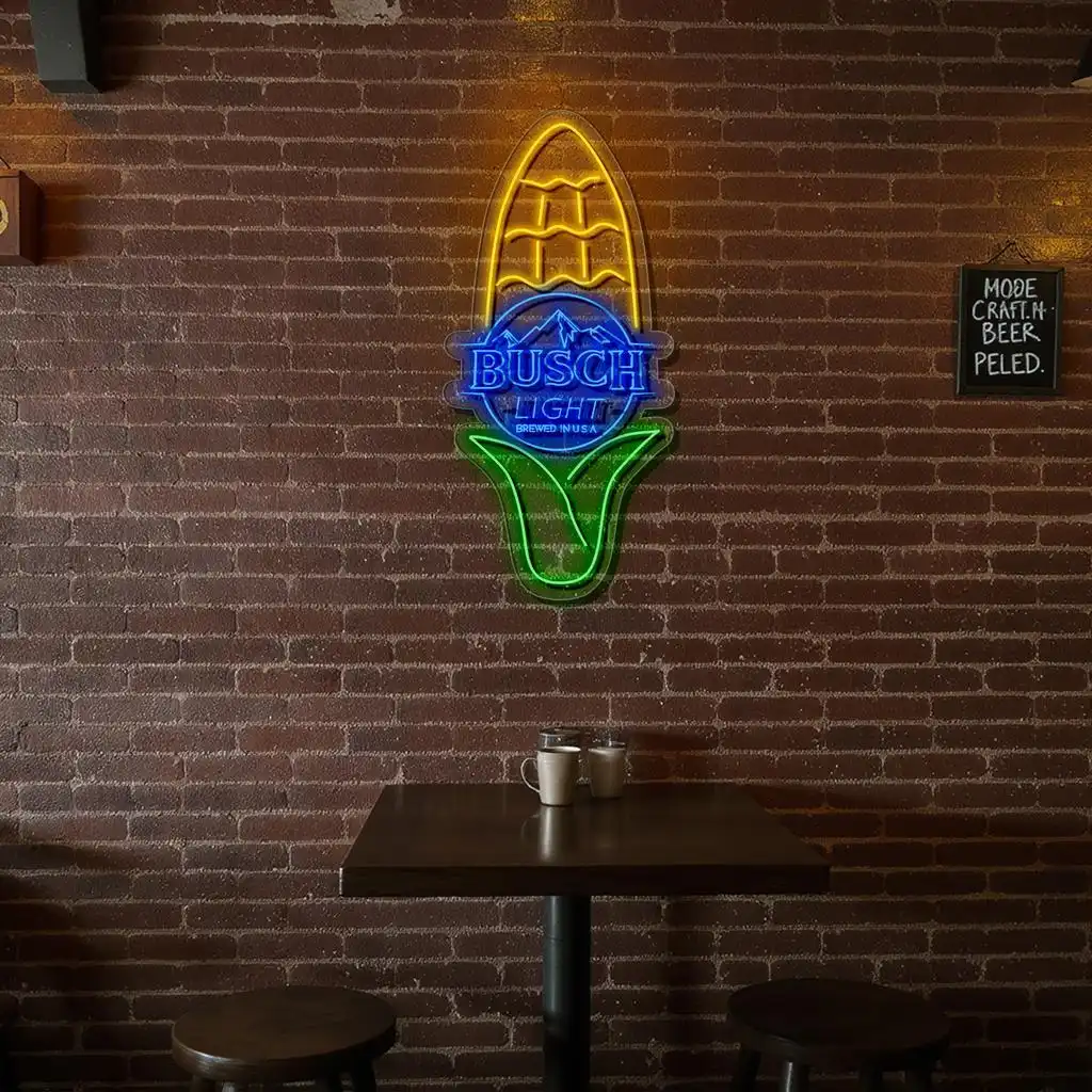 • Iconic Logo Emphasis: The bold blue neon surrounds the Busch Light logo, ensuring the brand name stands out clearly, reinforcing brand recognition while adding depth and contrast against the yellow corn and green husks.