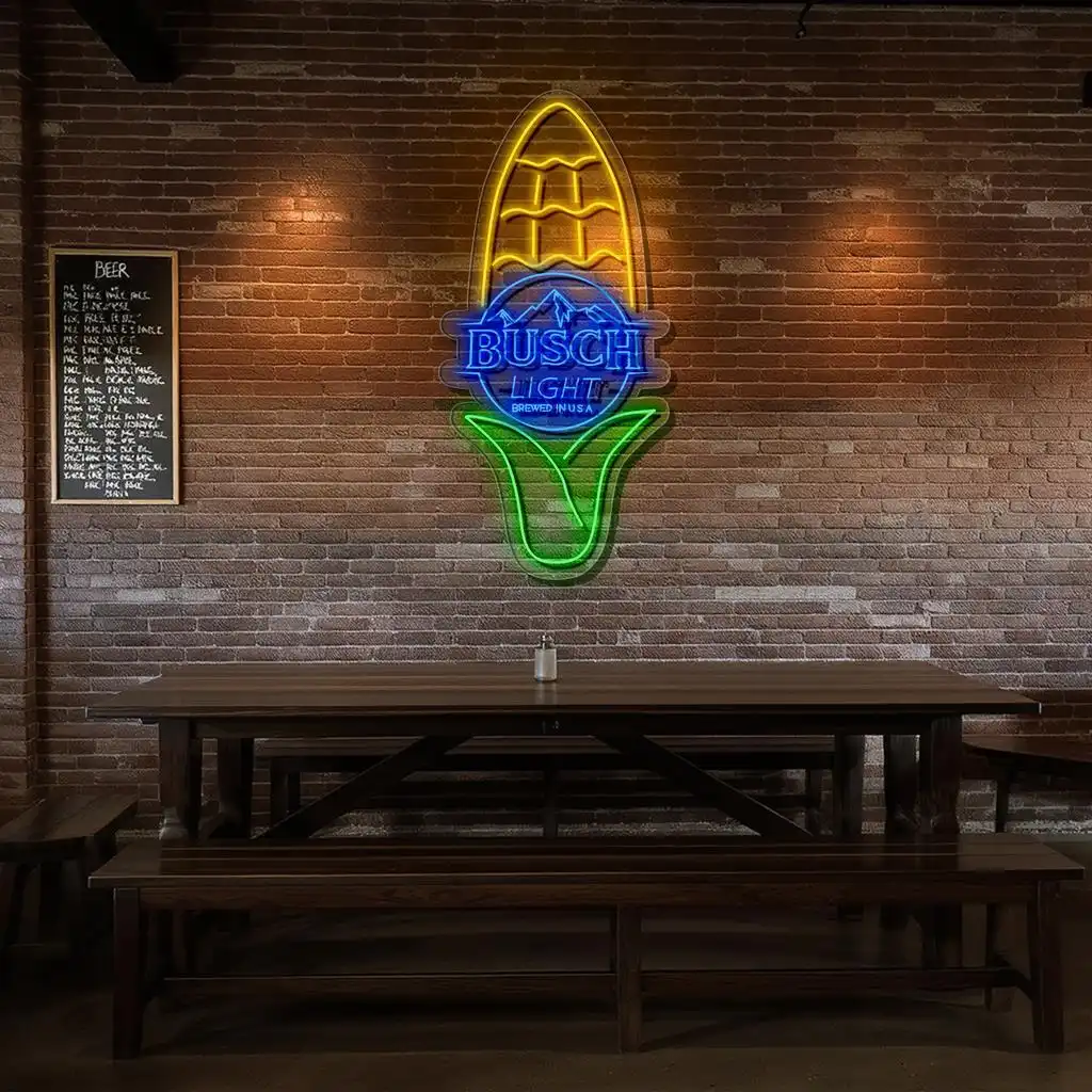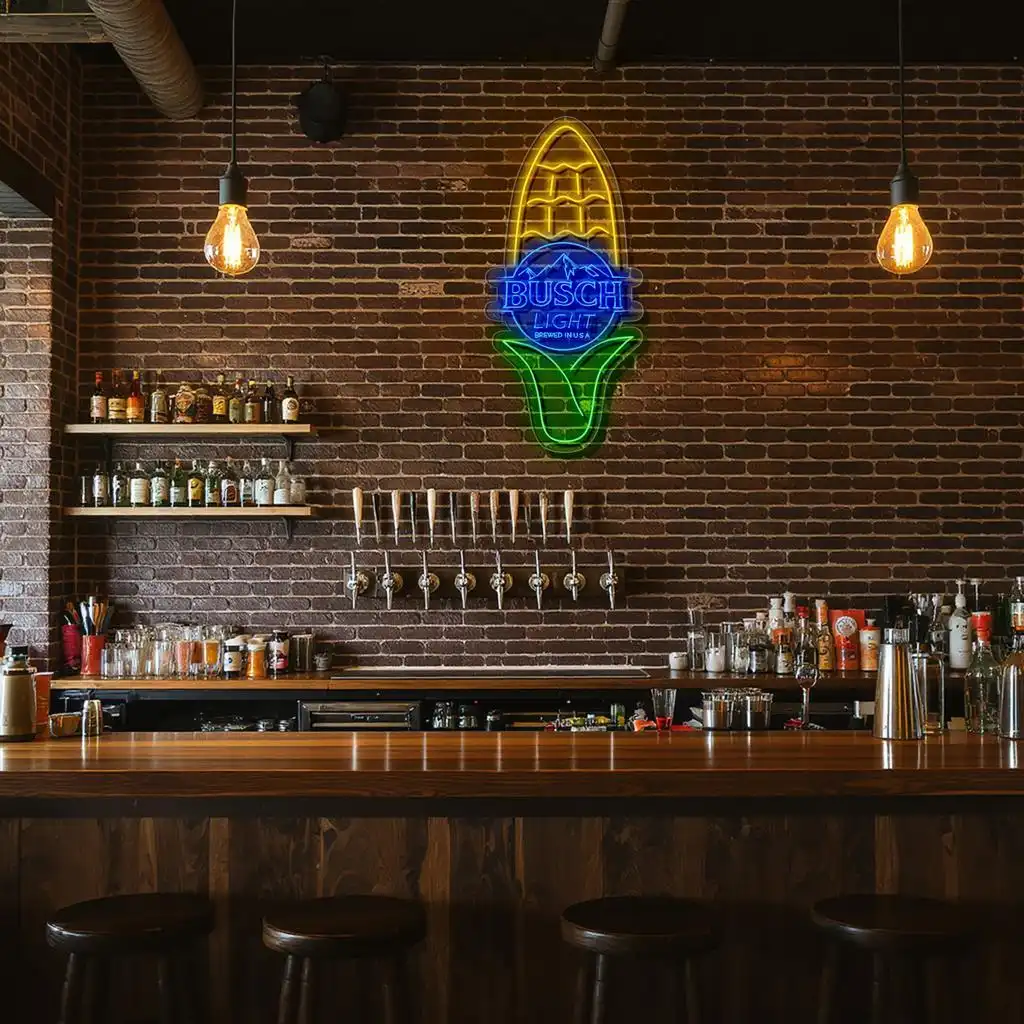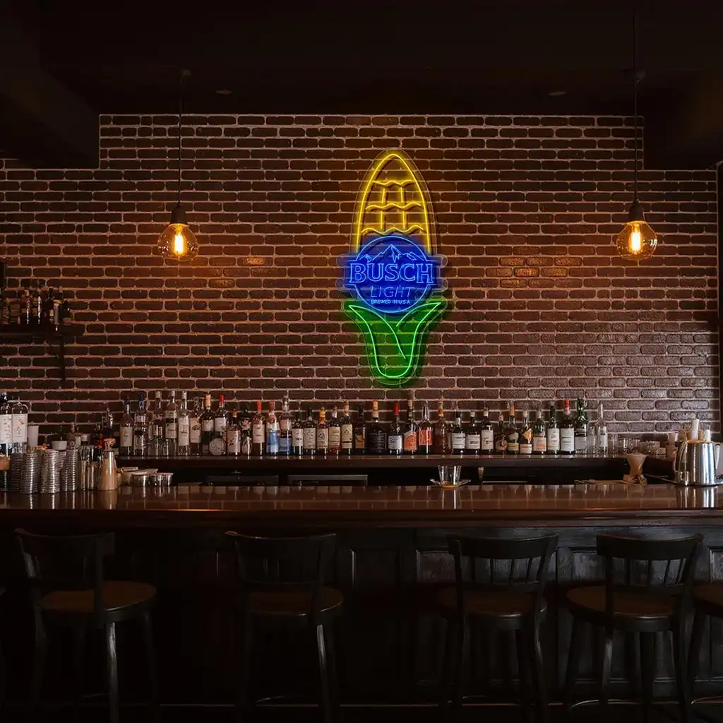 • Iconic Logo Emphasis: The bold blue neon surrounds the Busch Light logo, ensuring the brand name stands out clearly, reinforcing brand recognition while adding depth and contrast against the yellow corn and green husks.