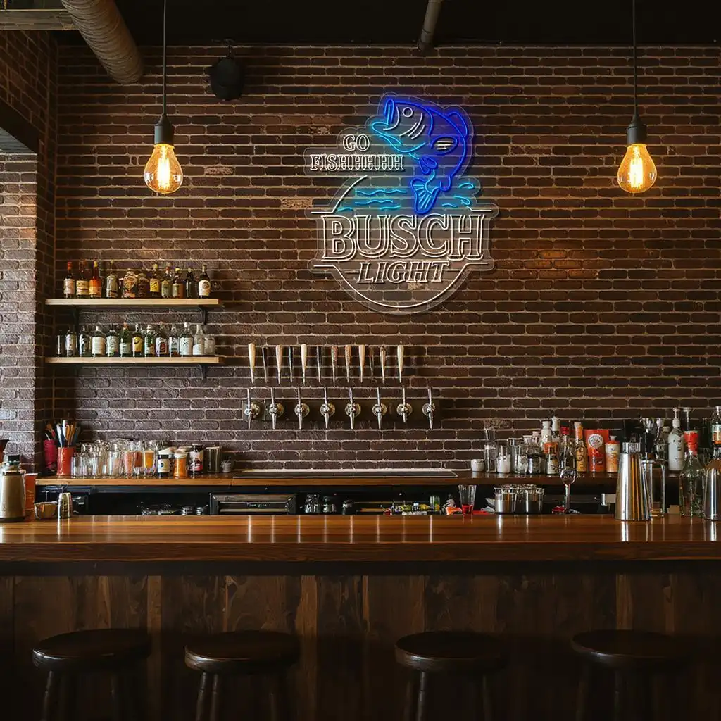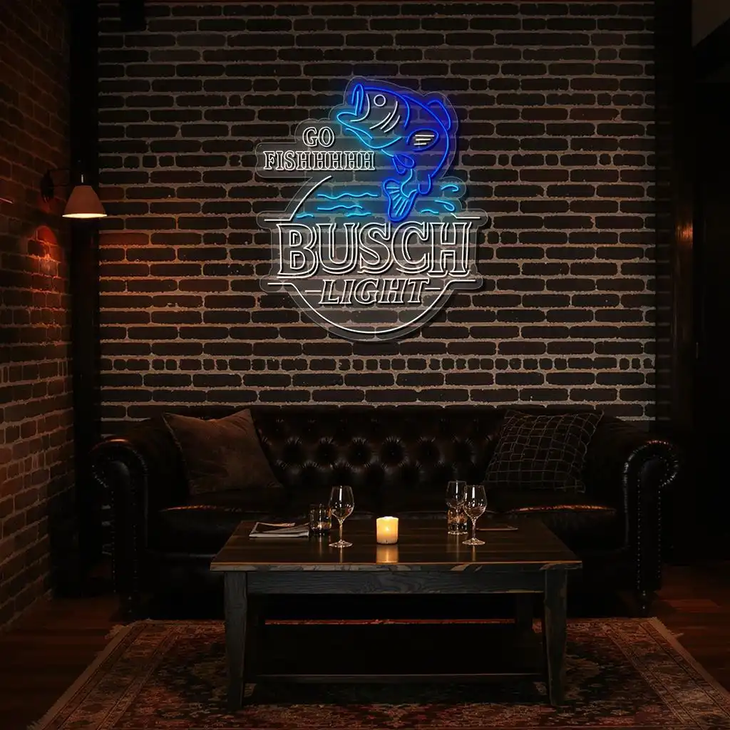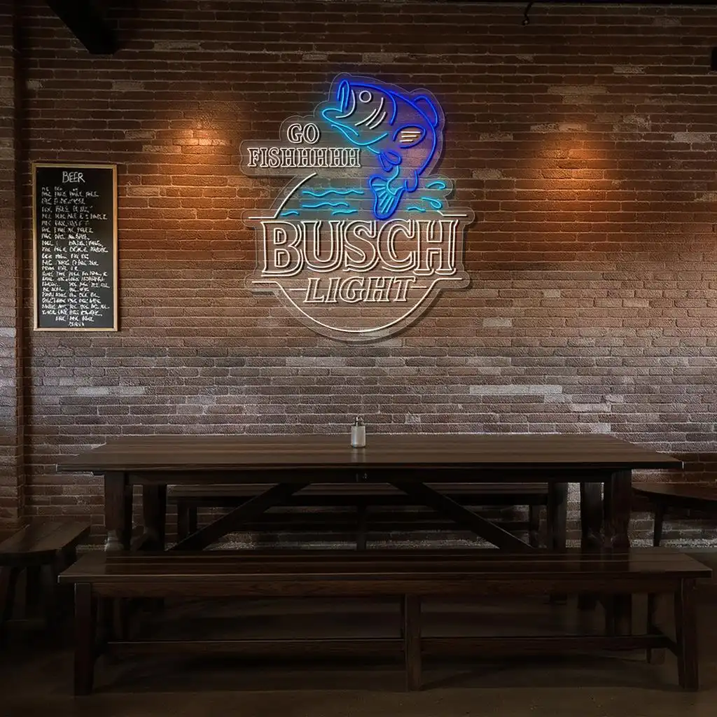 - White Light Accents: Crisp white neon highlights the key text elements, “GO FISHHHHH” and “BUSCH LIGHT,” ensuring high readability and brand recognition even from afar.