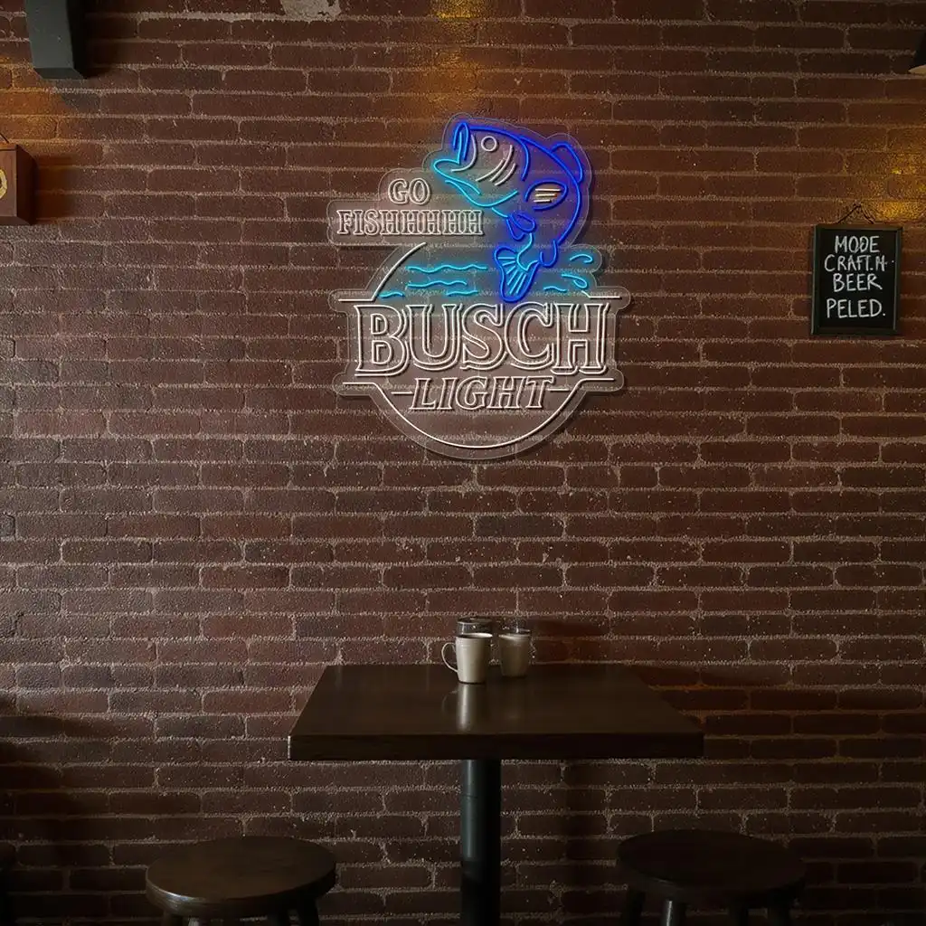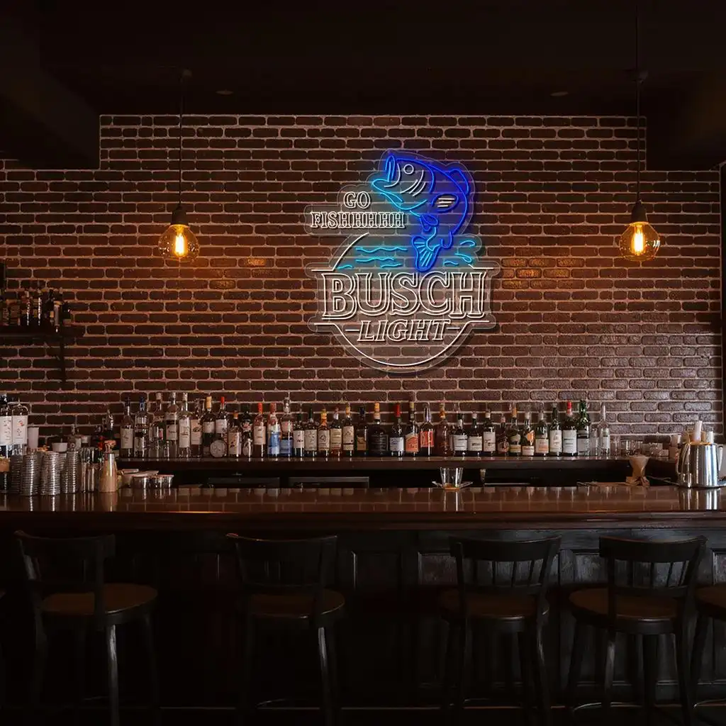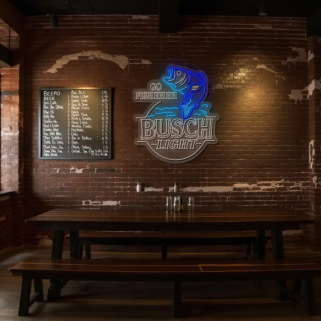 - White Light Accents: Crisp white neon highlights the key text elements, “GO FISHHHHH” and “BUSCH LIGHT,” ensuring high readability and brand recognition even from afar.