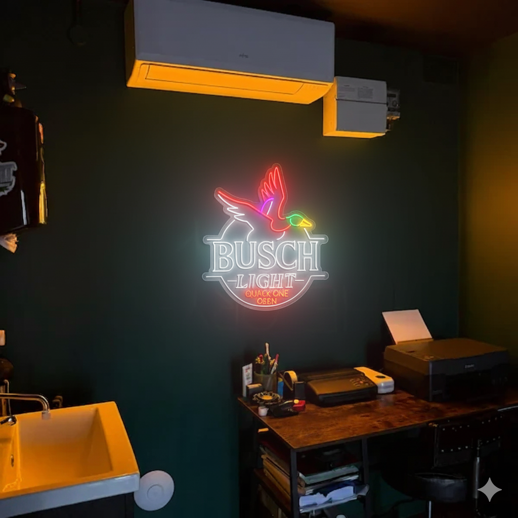 - Detailed Duck Silhouette: The flying duck design is meticulously outlined with smooth neon curves, adding motion and a lively personality that connects with the Busch Light brand’s outdoorsy spirit.