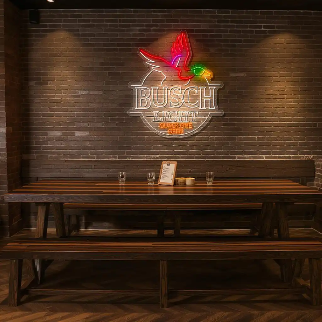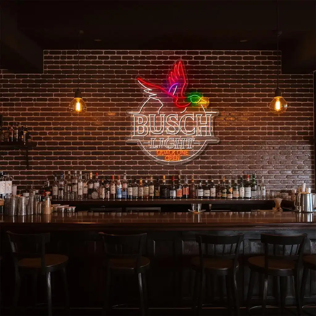 The Busch Light Neon Sign features a dynamic design that captures attention with its vibrant colors and intricate patterns. This eye-catching neon sign perfectly blends classic branding with a playful duck motif, making it a standout addition to any space.