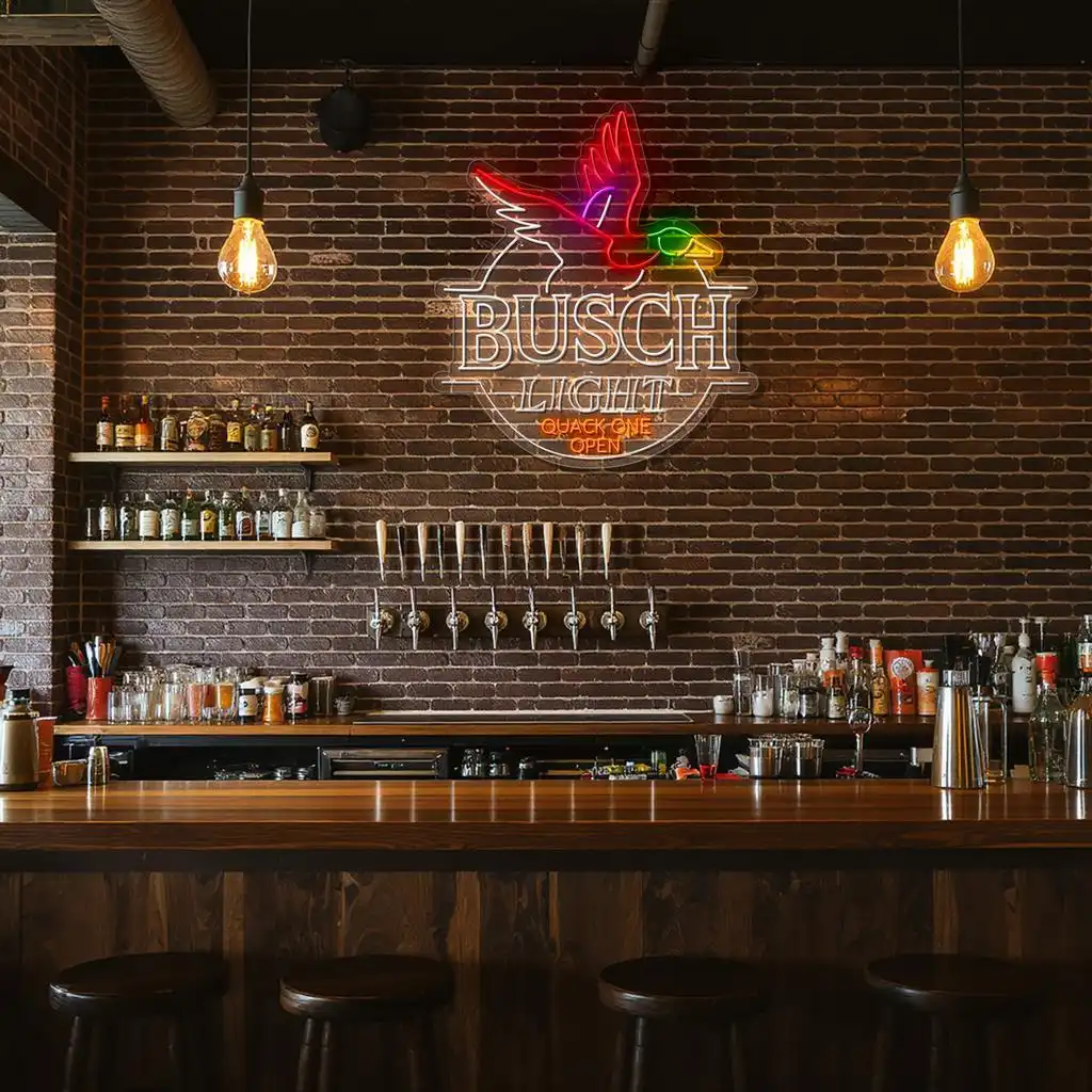 Vibrant Neon Busch Light Sign: Quack One Open Design Display
