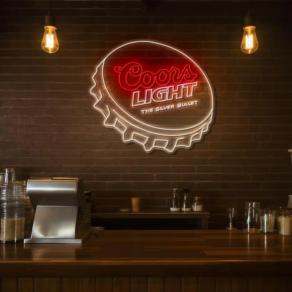 The Coors Light Neon Beer Sign features a bold bottle cap design highlighted by vibrant red and crisp white neon lights, perfectly capturing the iconic brand’s essence. This eye-catching neon sign is a must-have for any beer enthusiast or bar owner.