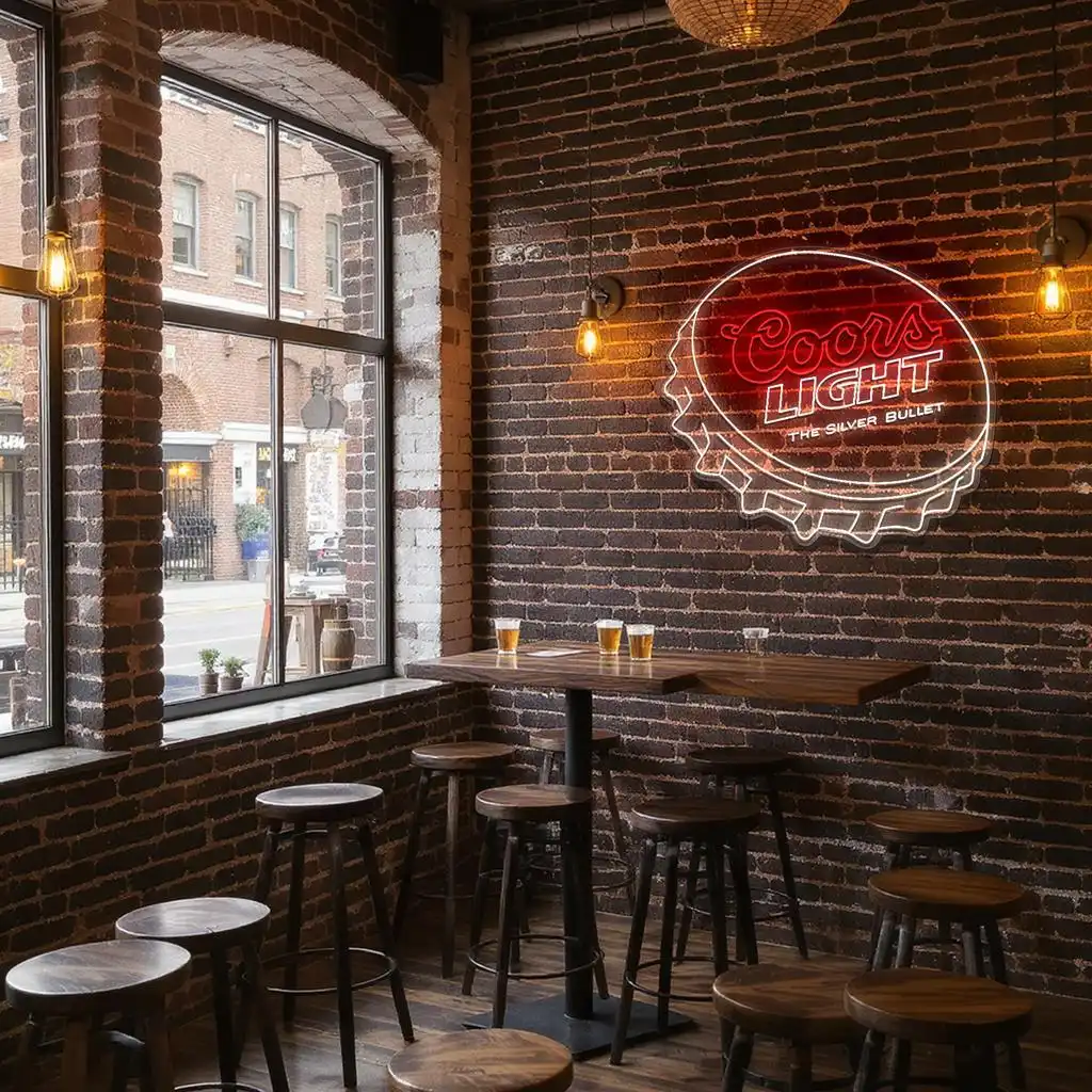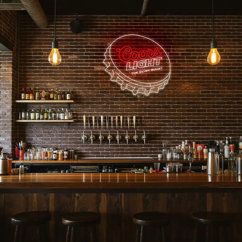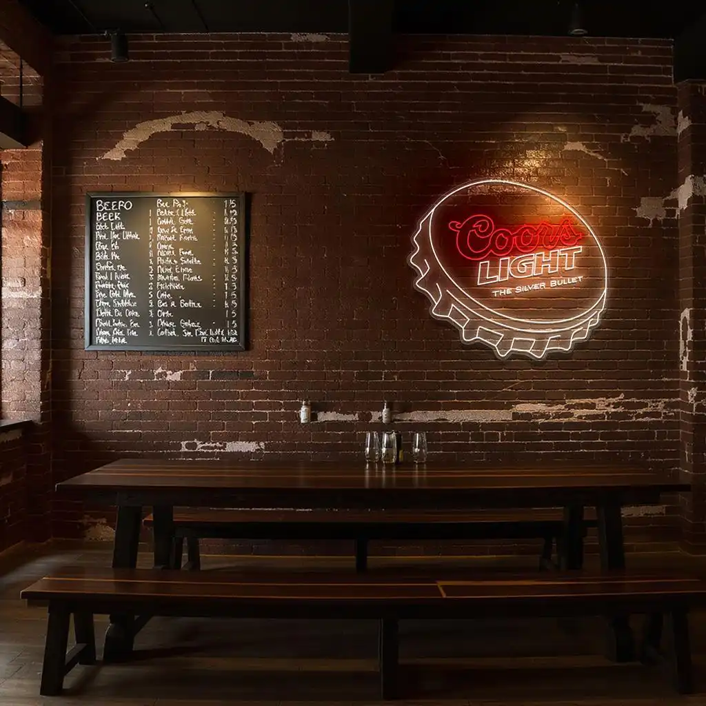 • Striking Color Coordination: The vivid red neon forms the instantly recognizable “Coors” script, exuding warmth and vibrancy, while the clean white neon outlines the bottle cap and highlights the word “LIGHT,” creating a sharp contrast that enhances visibility and appeal.