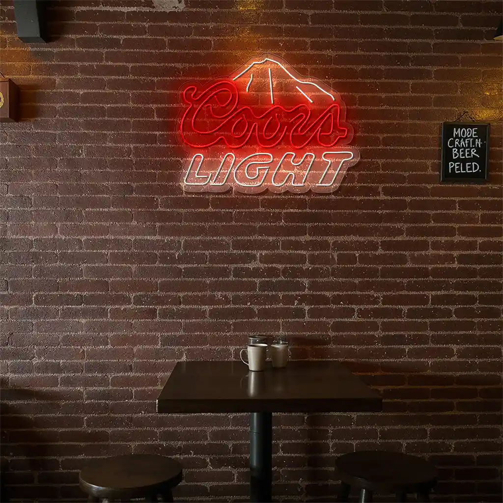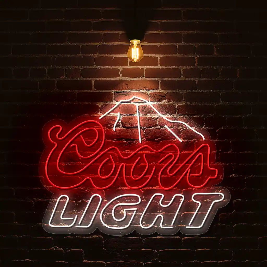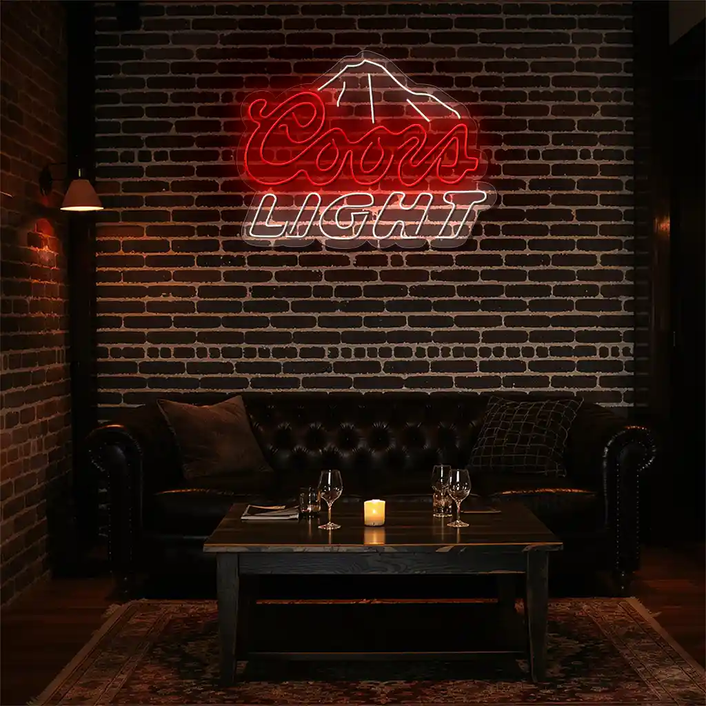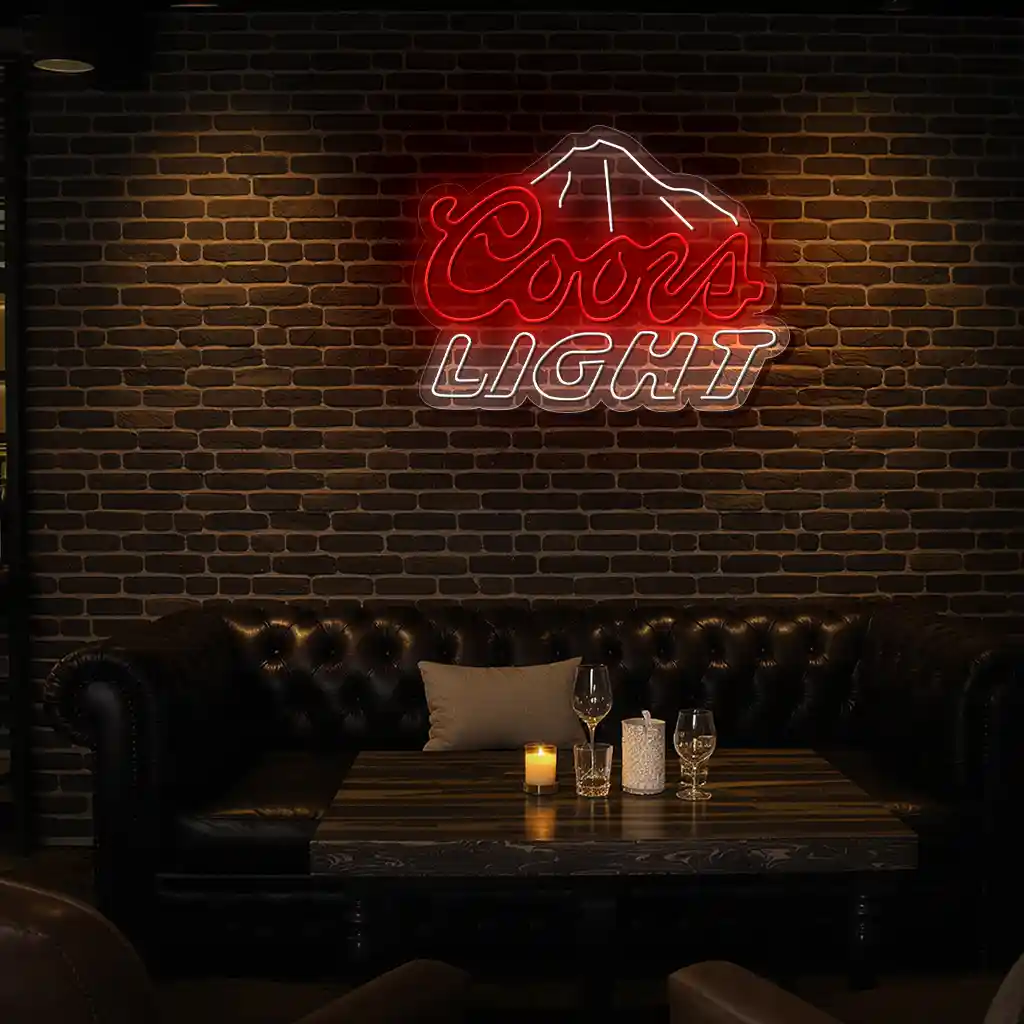 • Iconic Logo Display: The bold “Coors Light” script is illuminated with a warm red neon glow, making the brand instantly recognizable and adding a classic touch. The color contrast between the logo and mountain elements ensures the sign remains visually balanced and captivating.