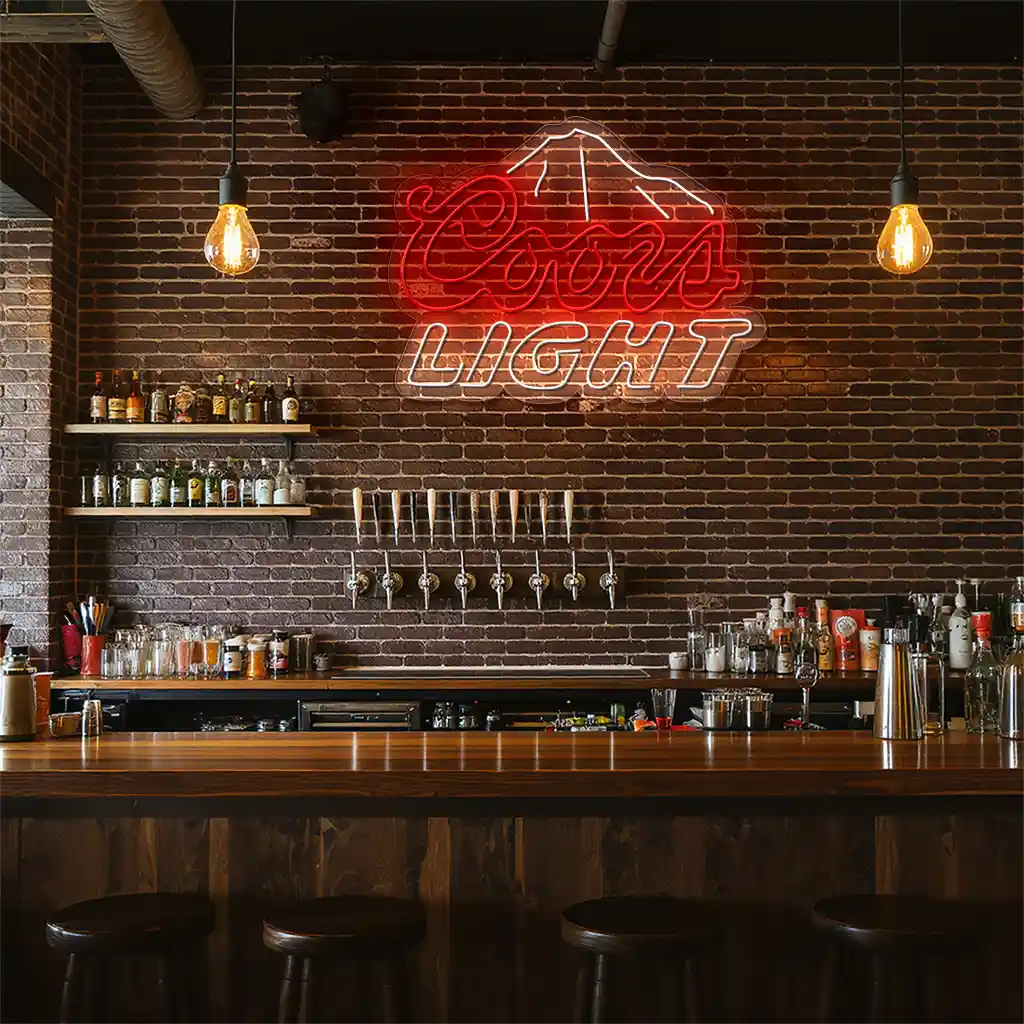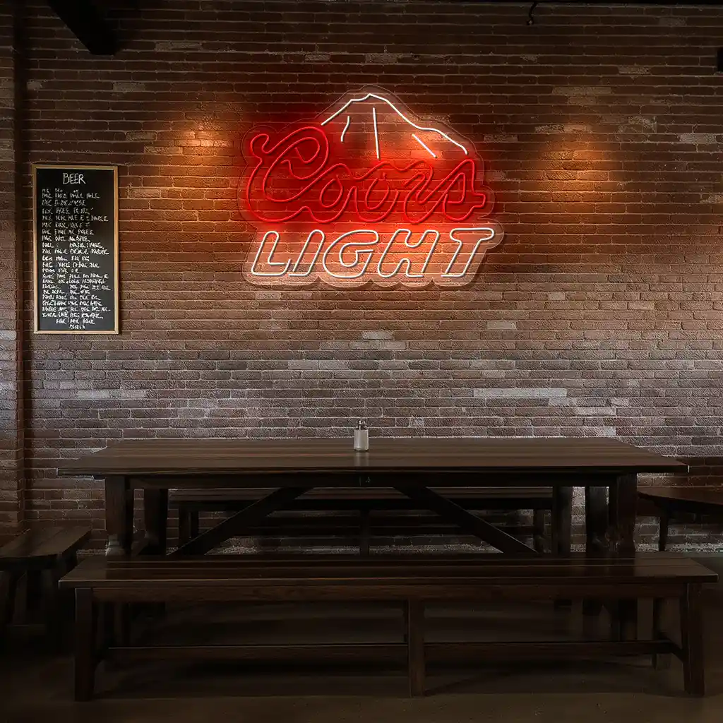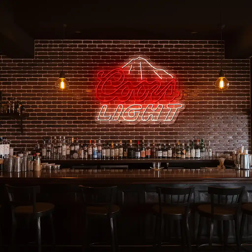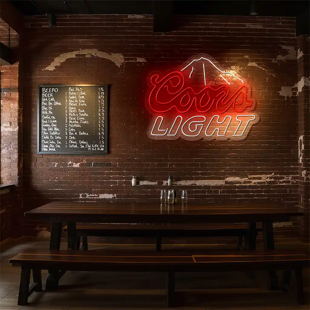 • Iconic Logo Display: The bold “Coors Light” script is illuminated with a warm red neon glow, making the brand instantly recognizable and adding a classic touch. The color contrast between the logo and mountain elements ensures the sign remains visually balanced and captivating.