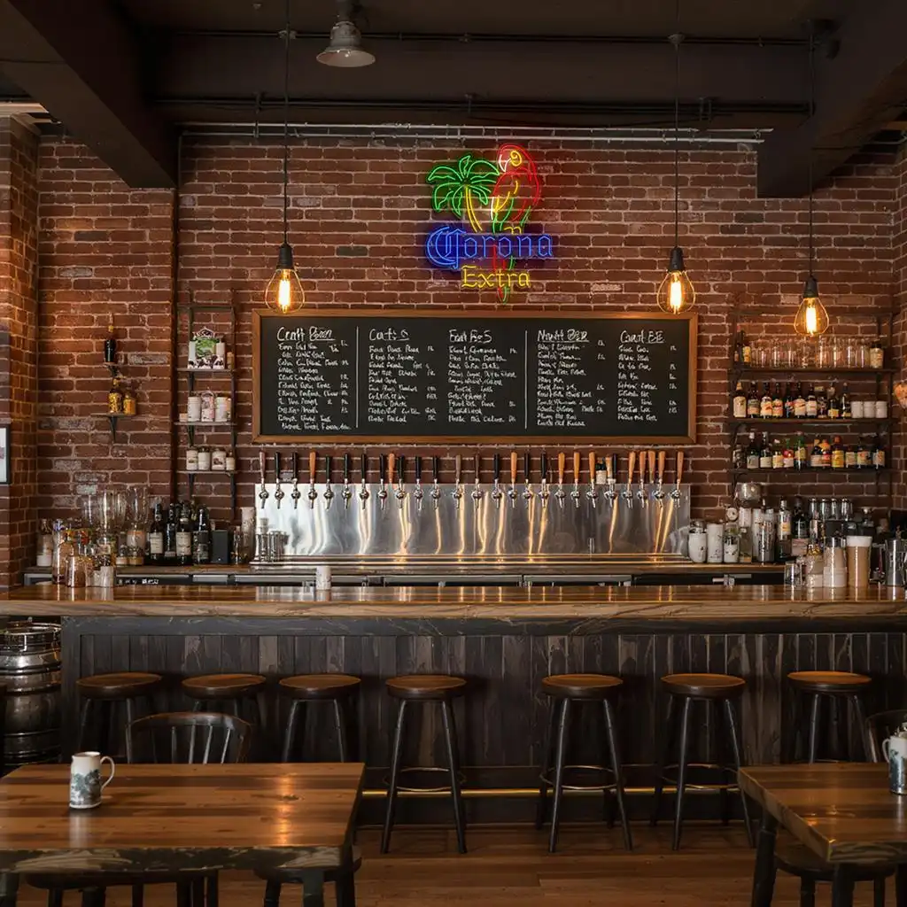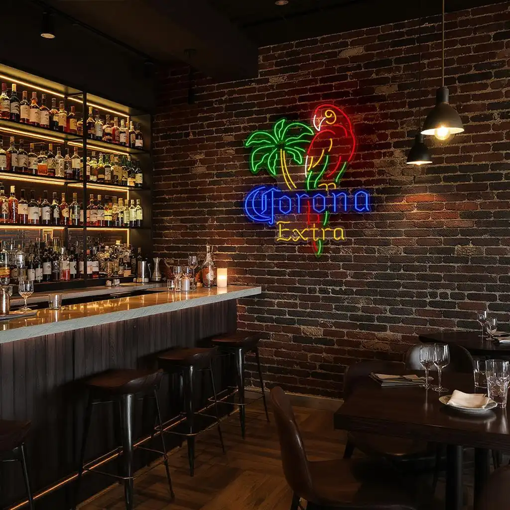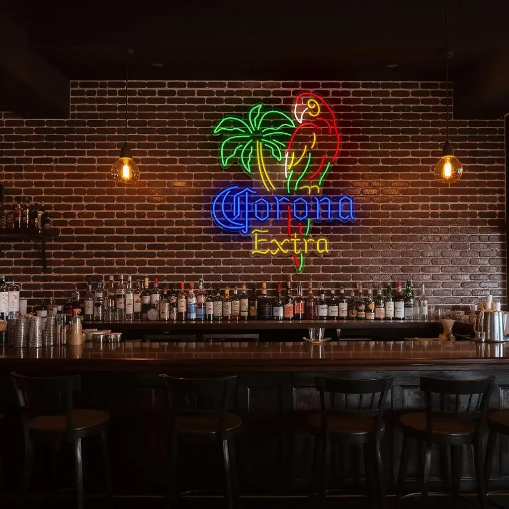 - Vivid Color Coordination: The neon sign uses bright green for the palm leaves, a rich red for the parrot’s feathers, and glowing blue and yellow for the “Corona Extra” text, creating a striking tropical theme that instantly draws attention.