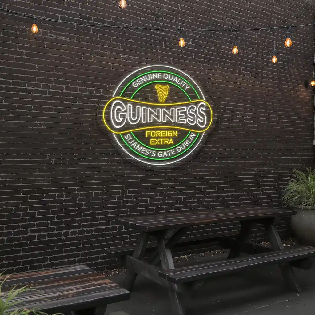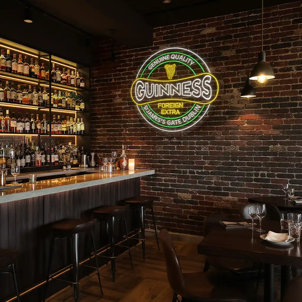 - Vibrant Color Coordination: This neon sign uses a harmonious combination of bright white, vivid green, and warm yellow light to accentuate the iconic Guinness logo, ensuring high visibility and a lively ambiance that attracts attention instantly.