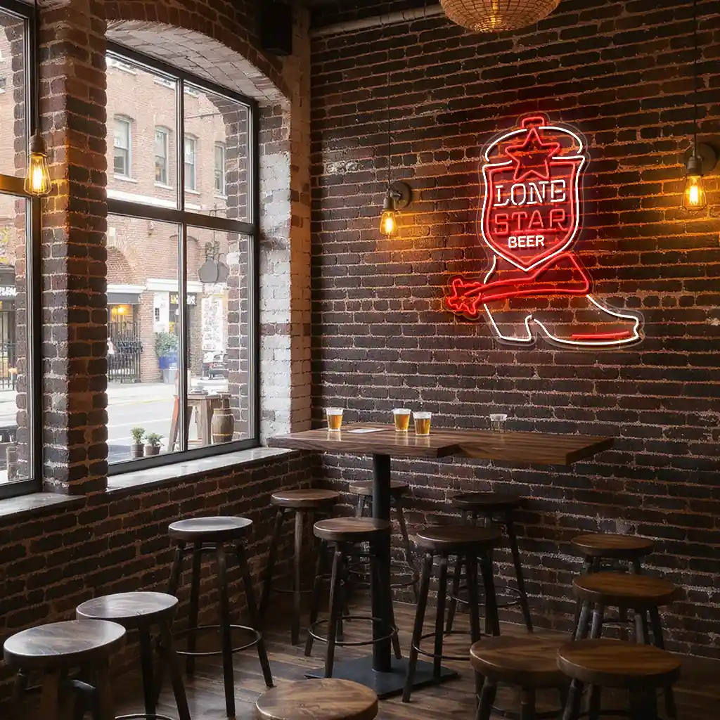 - Dynamic Color Coordination: The neon sign’s colors are thoughtfully selected to highlight the iconic cowboy boot design. Bright reds and blues intertwine with crisp white accents to evoke the classic Lone Star Beer branding, creating a lively and inviting ambiance perfect for bars, game rooms, or man caves.