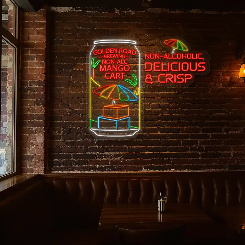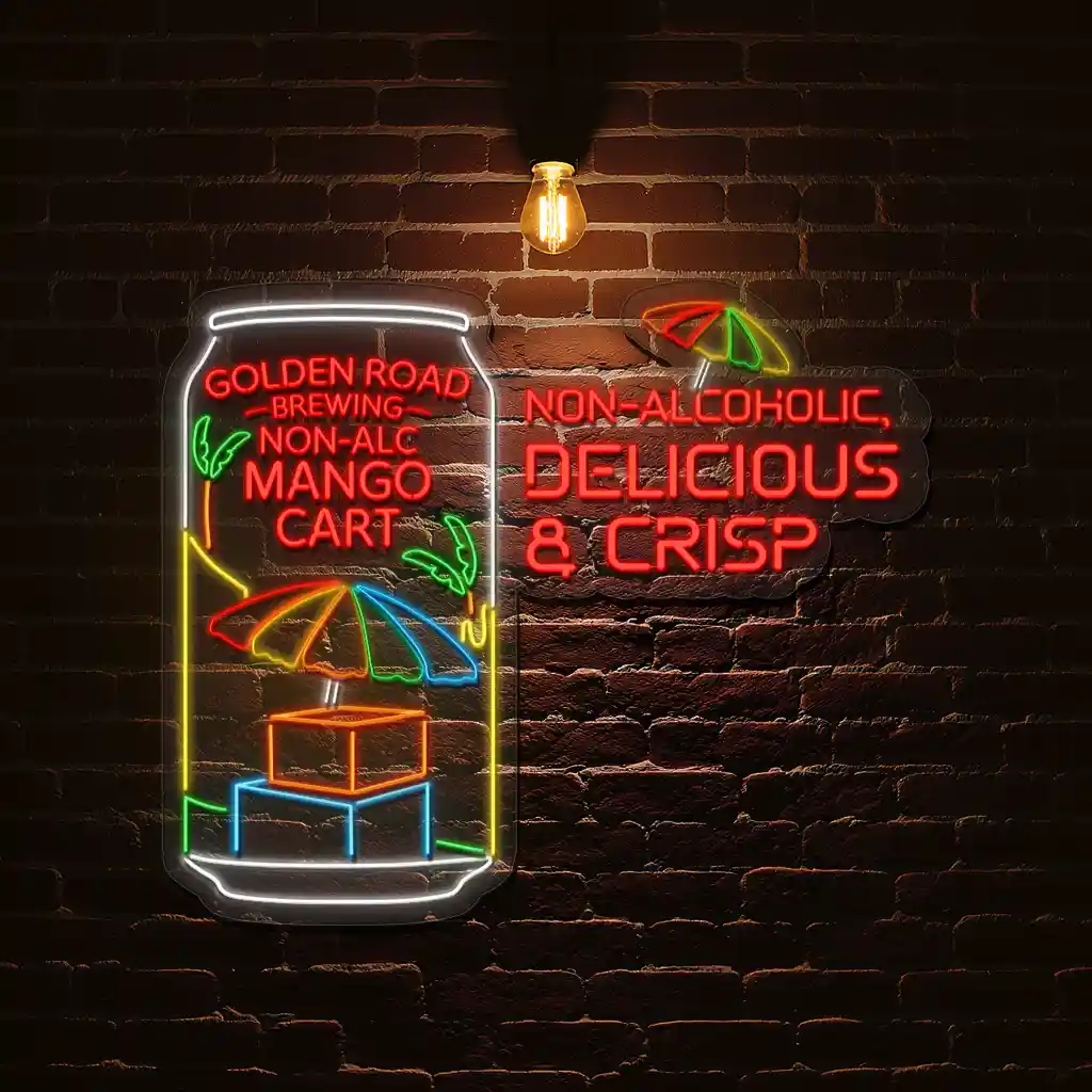 Bright Neon Signs for Non-Alcoholic Mango Cart Drinks and Fun bring a vibrant and eye-catching design to any space. Featuring a playful mango cart imagery combined with crisp, colorful text, this neon sign perfectly captures the refreshing essence of non-alcoholic mango beverages while adding a lively glow that draws attention and sets a cheerful atmosphere.