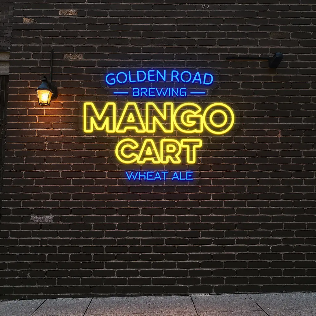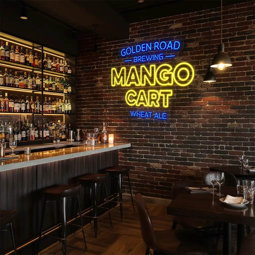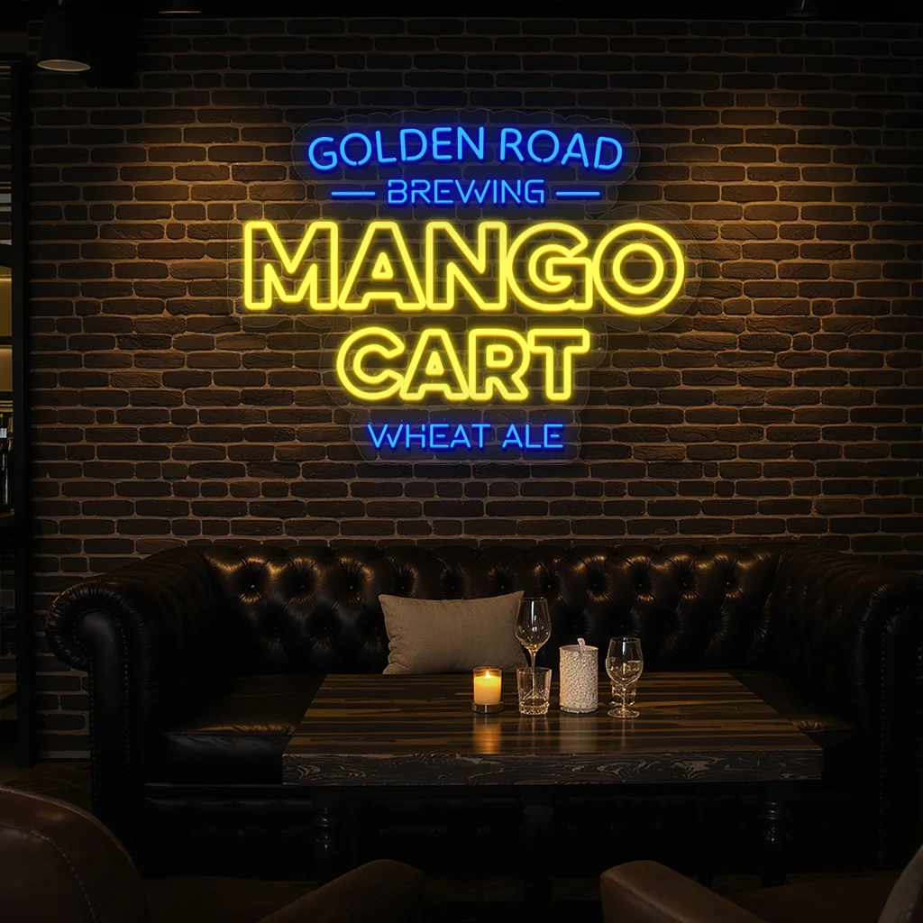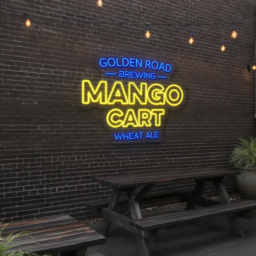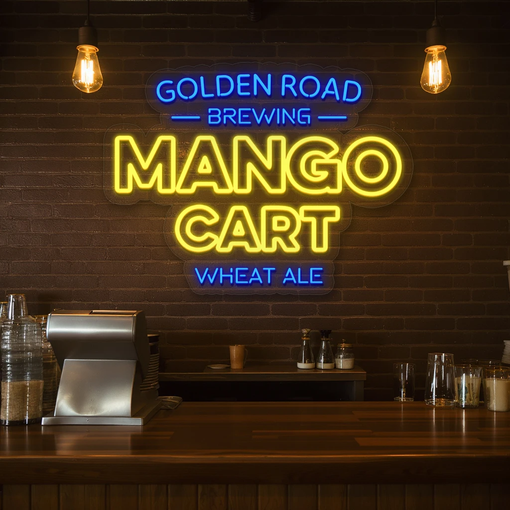 • Striking Color Coordination: The combination of deep blue for “Golden Road Brewing” and “Wheat Ale,” paired with the bright yellow for “Mango Cart,” captures attention instantly, reflecting the fresh, tropical essence of the mango wheat ale. This color pairing not only boosts visibility but also evokes a warm, tropical ambiance perfect for bars and lounges. Explore more about Mango Cart Neon Signs.