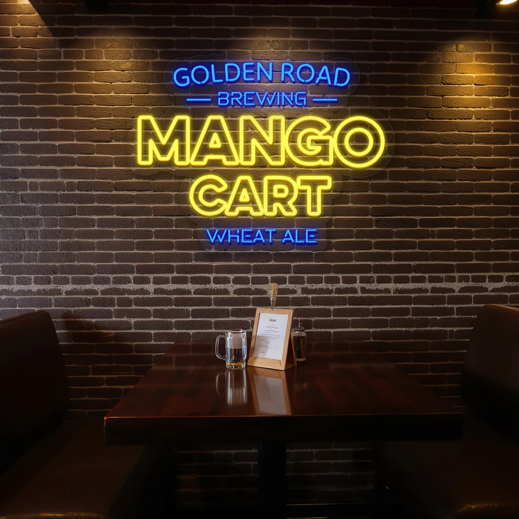 The Neon Signs for Golden Road Brewing’s Mango Cart Wheat Ale Design features a vibrant fusion of colors meticulously arranged to highlight the iconic brand and its refreshing ale. This eye-catching neon sign uses bold blue and bright yellow hues, creating a dynamic visual appeal that enhances any space with a lively, inviting glow.