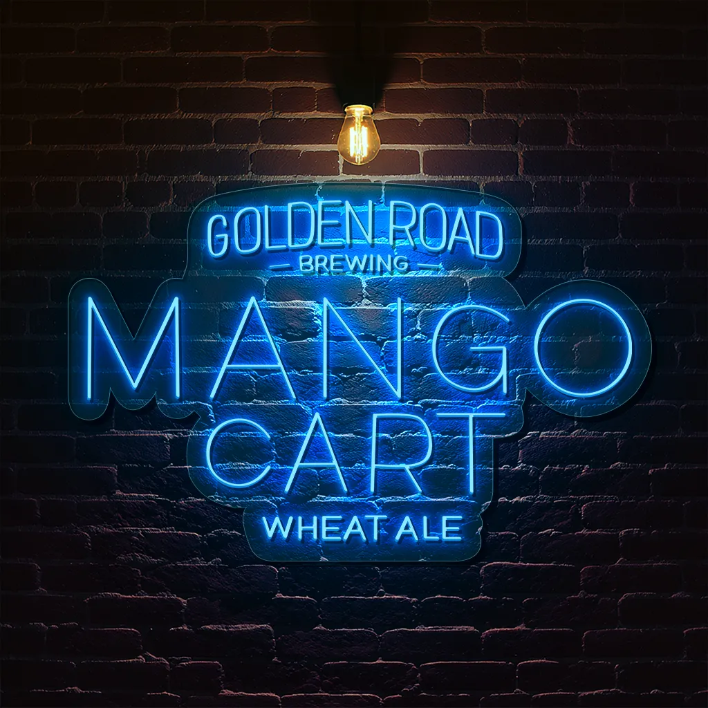 The Stylish Neon Signs for Golden Road Brewing’s Mango Cart Ale capture attention with their vibrant blue glow and sleek, modern typography. This visually striking design complements any bar or entertainment space, highlighting the Mango Cart Wheat Ale with a cool and inviting ambiance that elevates the atmosphere instantly.
