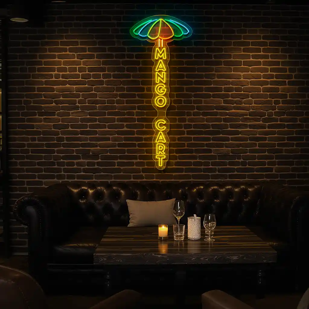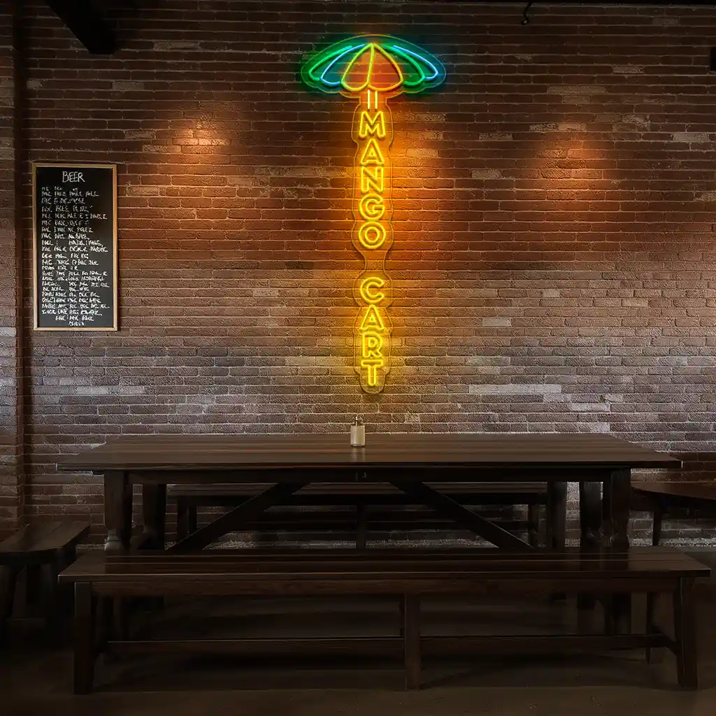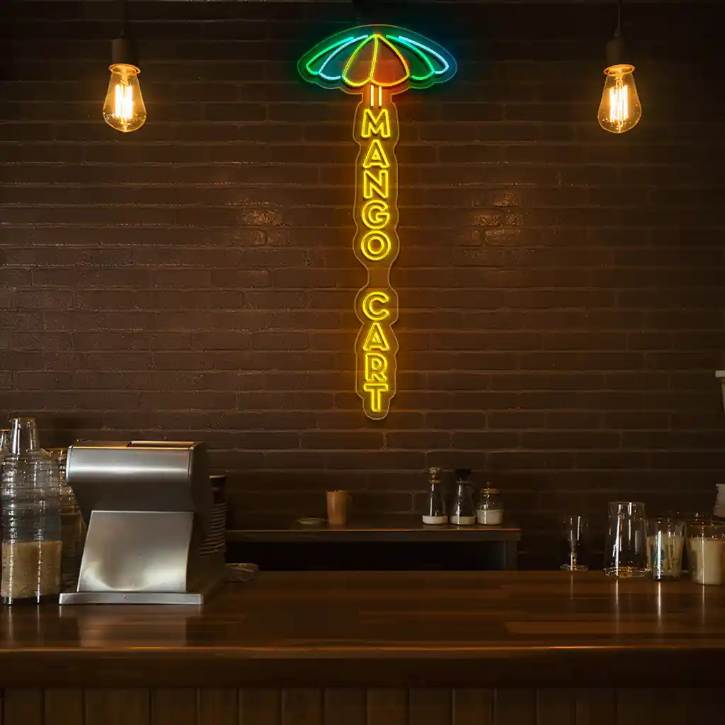 - Bold Lettering Design: The vertical “MANGO CART” text glows vibrantly in warm yellow neon, ensuring readability from a distance. The clear and bright lettering serves as an effective focal point, making this Mango Cart Neon Signs ideal for businesses, patios, or home bars.