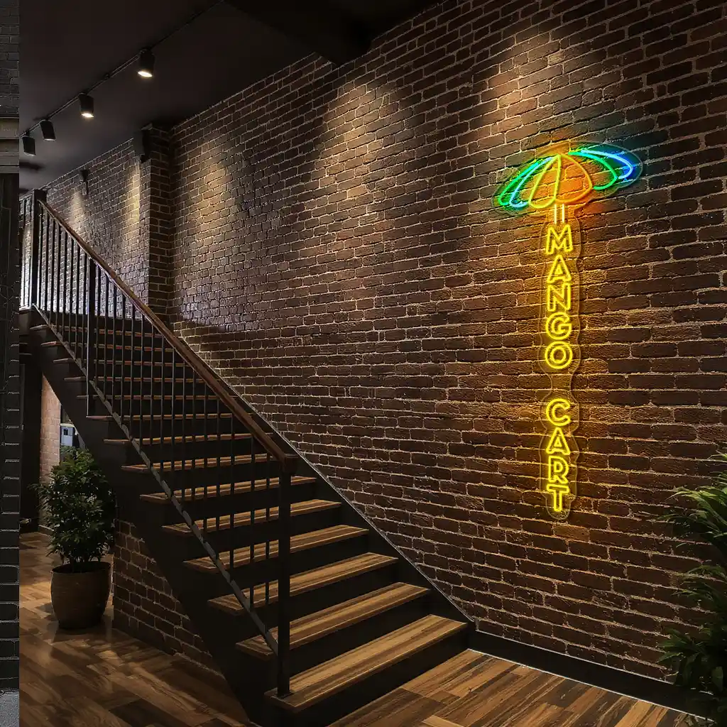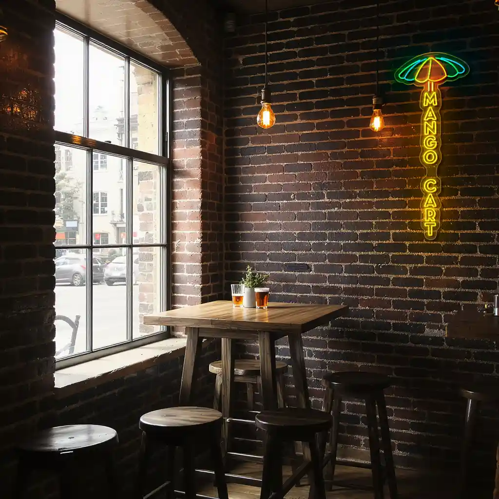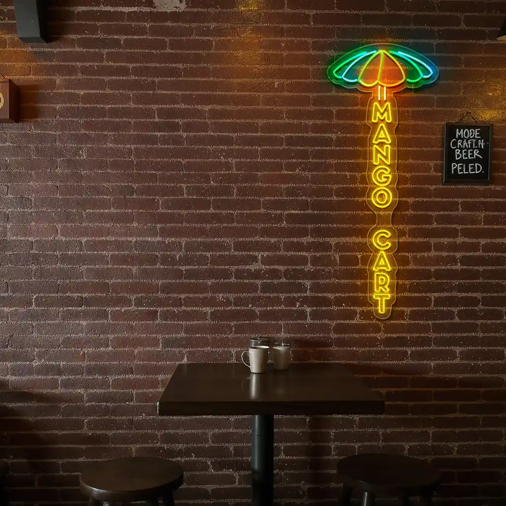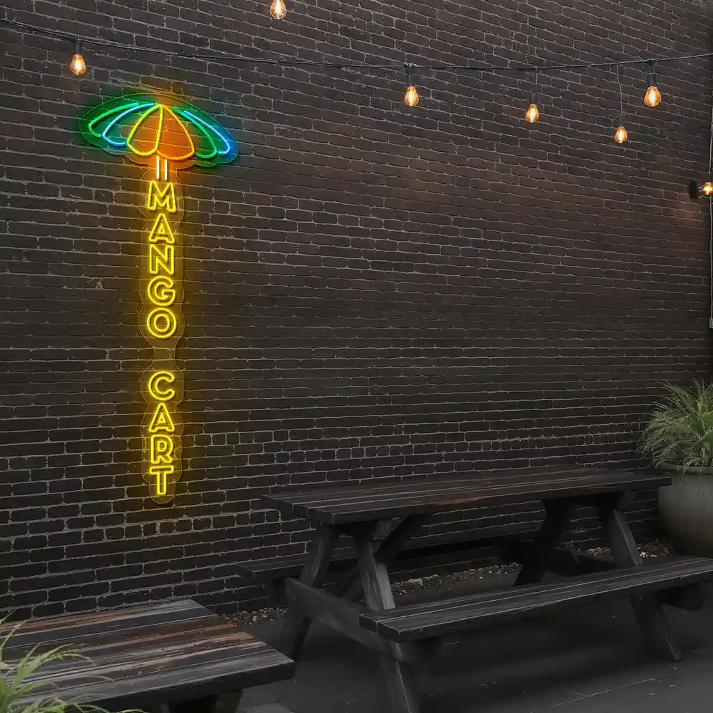 - Bold Lettering Design: The vertical “MANGO CART” text glows vibrantly in warm yellow neon, ensuring readability from a distance. The clear and bright lettering serves as an effective focal point, making this Mango Cart Neon Signs ideal for businesses, patios, or home bars.