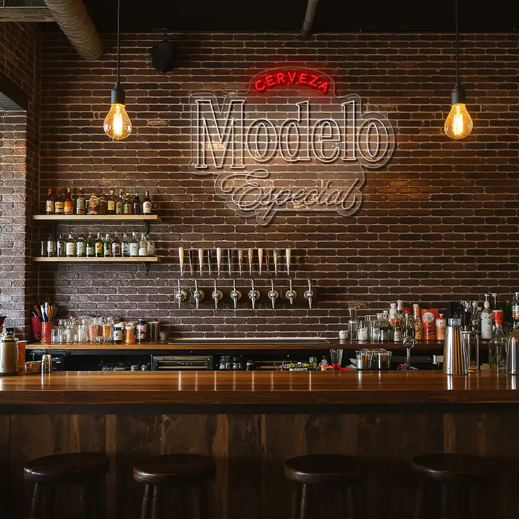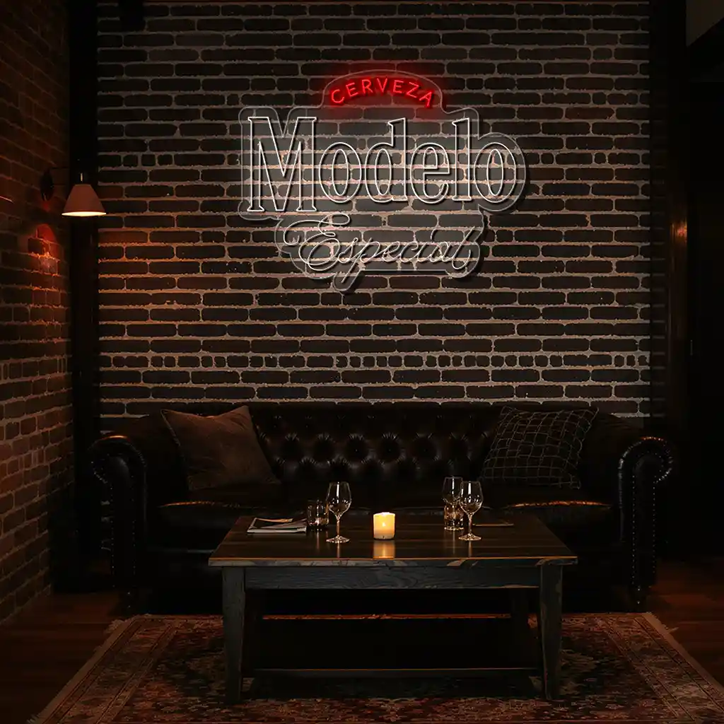 - Refined Typography Highlights: The bold block letters of “Modelo” are outlined in clean white neon, emphasizing strength and tradition. Below, the script-style “Especial” is rendered in flowing cursive with softer white neon, adding an elegant touch that balances modernity with vintage charm.