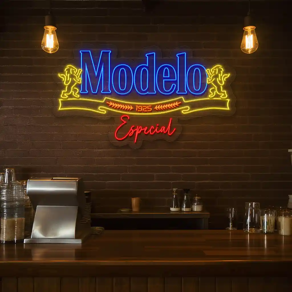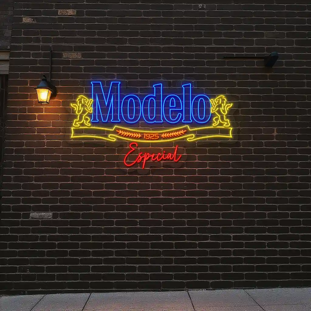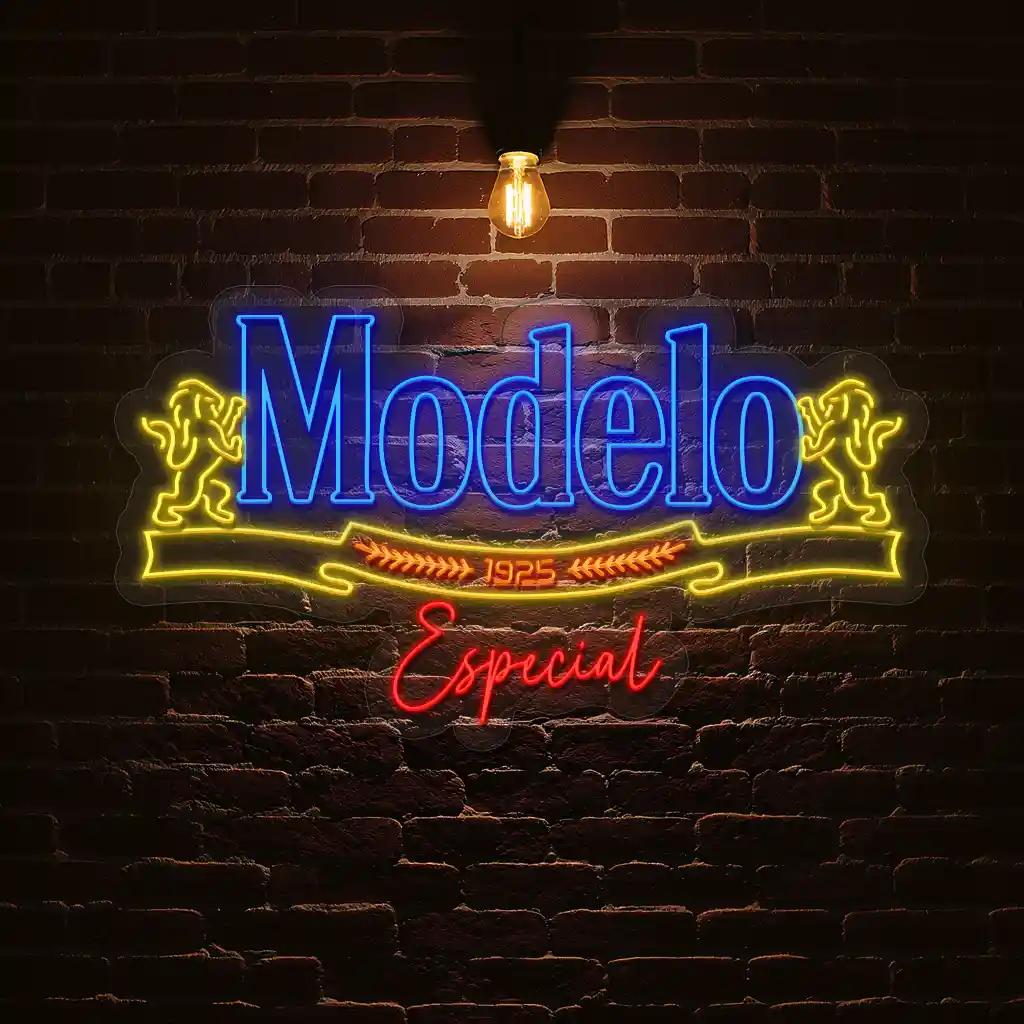 - Striking Color Coordination: Featuring a vivid blue for the “Modelo” text, bright yellow lions, and accents, alongside a warm red “Especial” script, this neon sign artfully balances contrasting colors to create a visually dynamic centerpiece.