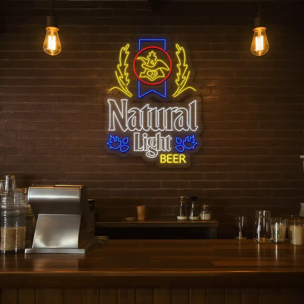 - Dynamic Color Coordination: The use of bright white for the “Natural Light” text ensures excellent readability, while the contrasting yellow “BEER” highlights the product, making it pop against darker settings. Accents of red and blue add depth and vibrancy, creating a visually compelling display that elevates any bar decor.