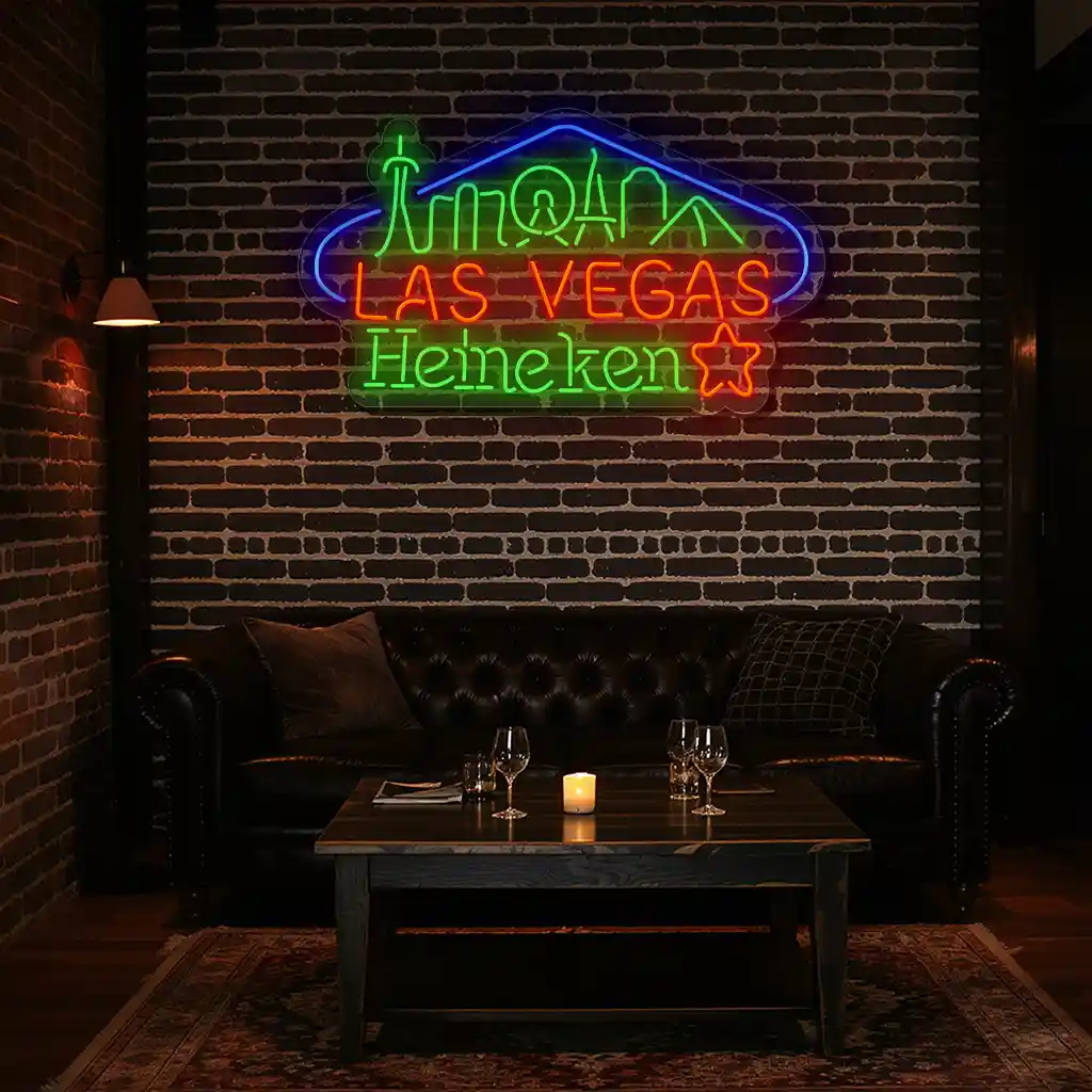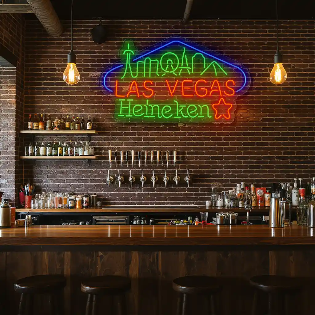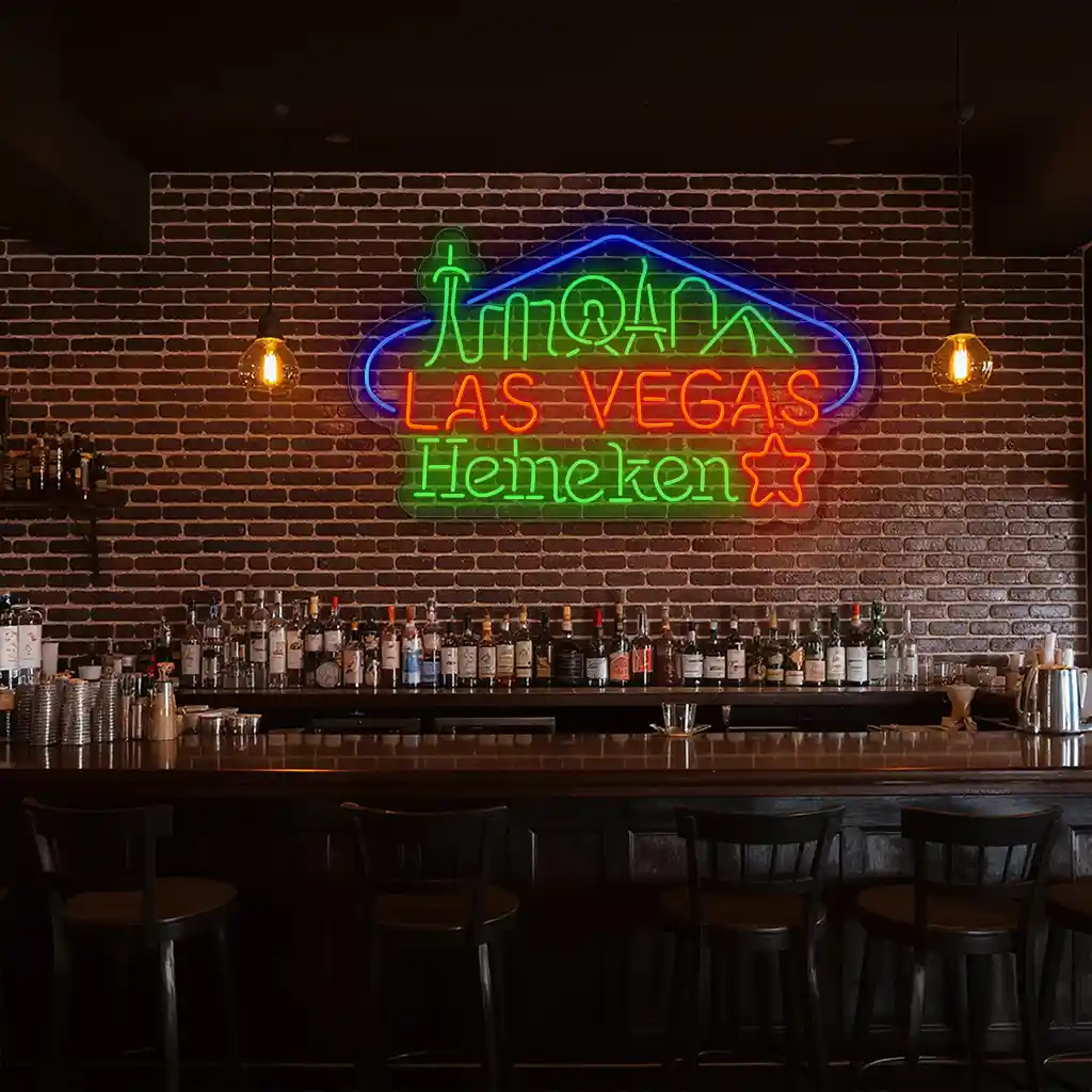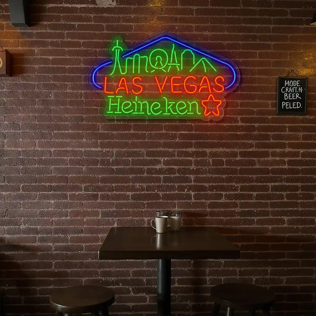 - Dynamic Color Coordination: The vivid green, bold red, and bright blue neon tubes are expertly coordinated to highlight the Las Vegas skyline and the classic Heineken branding, creating an eye-catching visual impact that energizes any room.