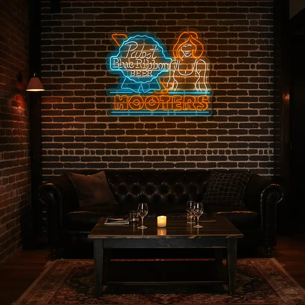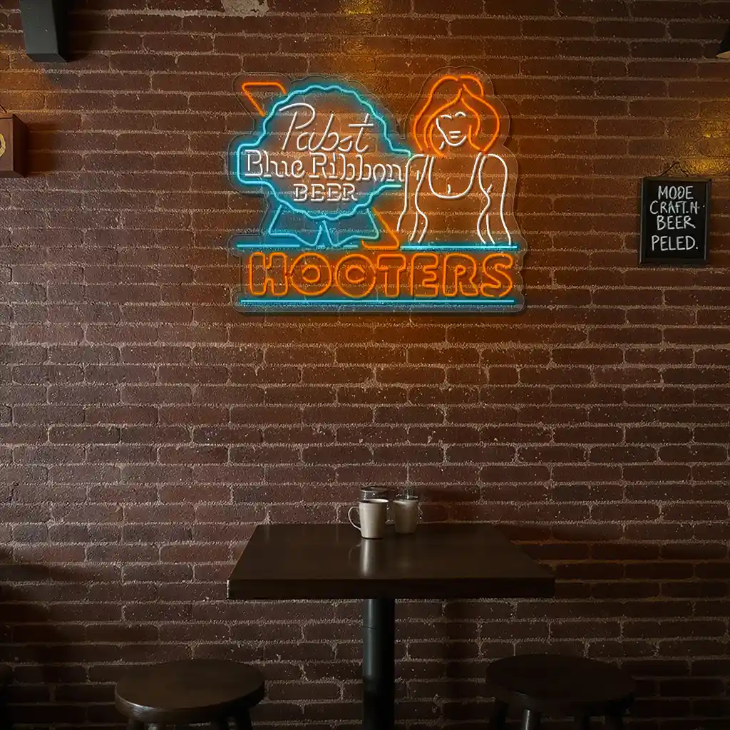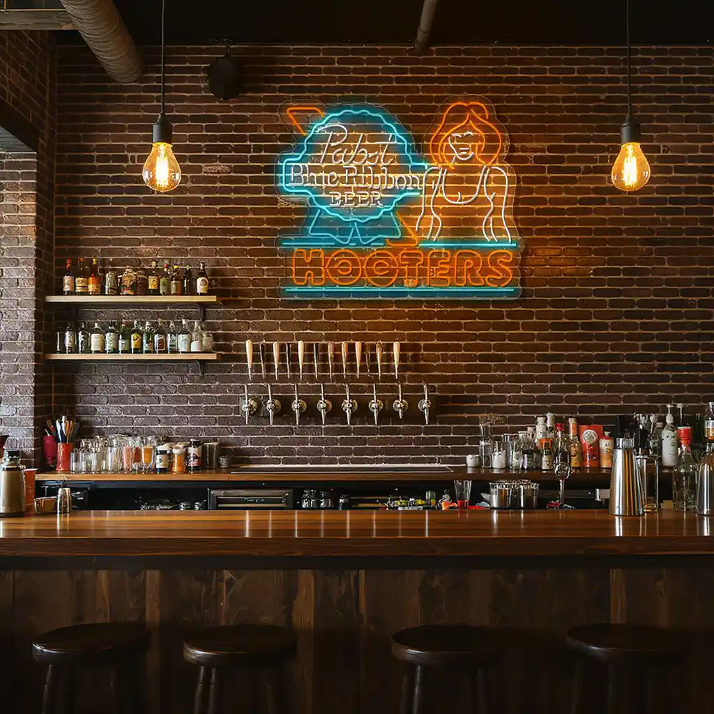 Neon Signs: Pabst Beer and Hooters Bar Decor Inspiration brings vibrant energy and nostalgic charm to any space. This product features expertly crafted neon patterns that combine classic beer branding with lively bar motifs, using bold colors to create an inviting and memorable atmosphere.