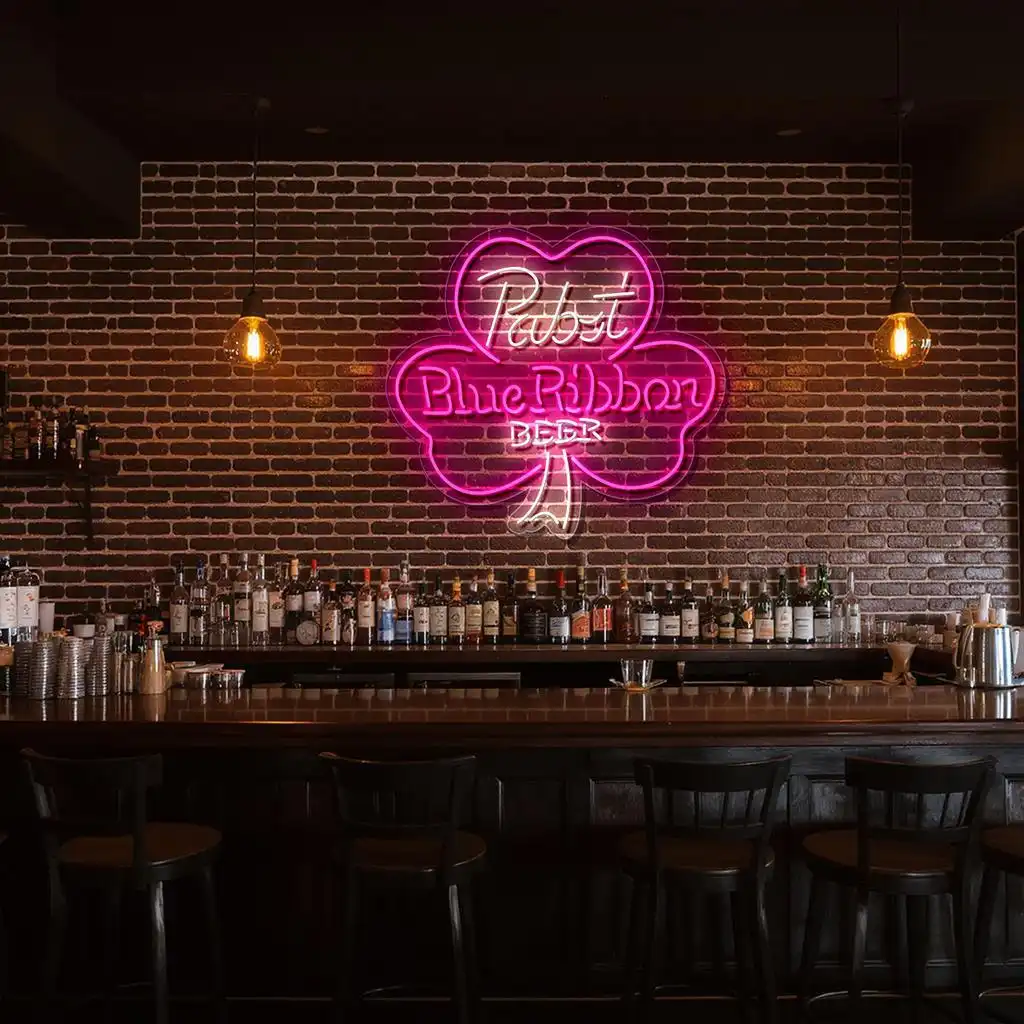 - Color Coordination: The bold pink neon outlines the shamrock, creating a vivid backdrop that enhances the white neon lettering, making “Pabst” and “Beer” stand out with exceptional clarity and style.