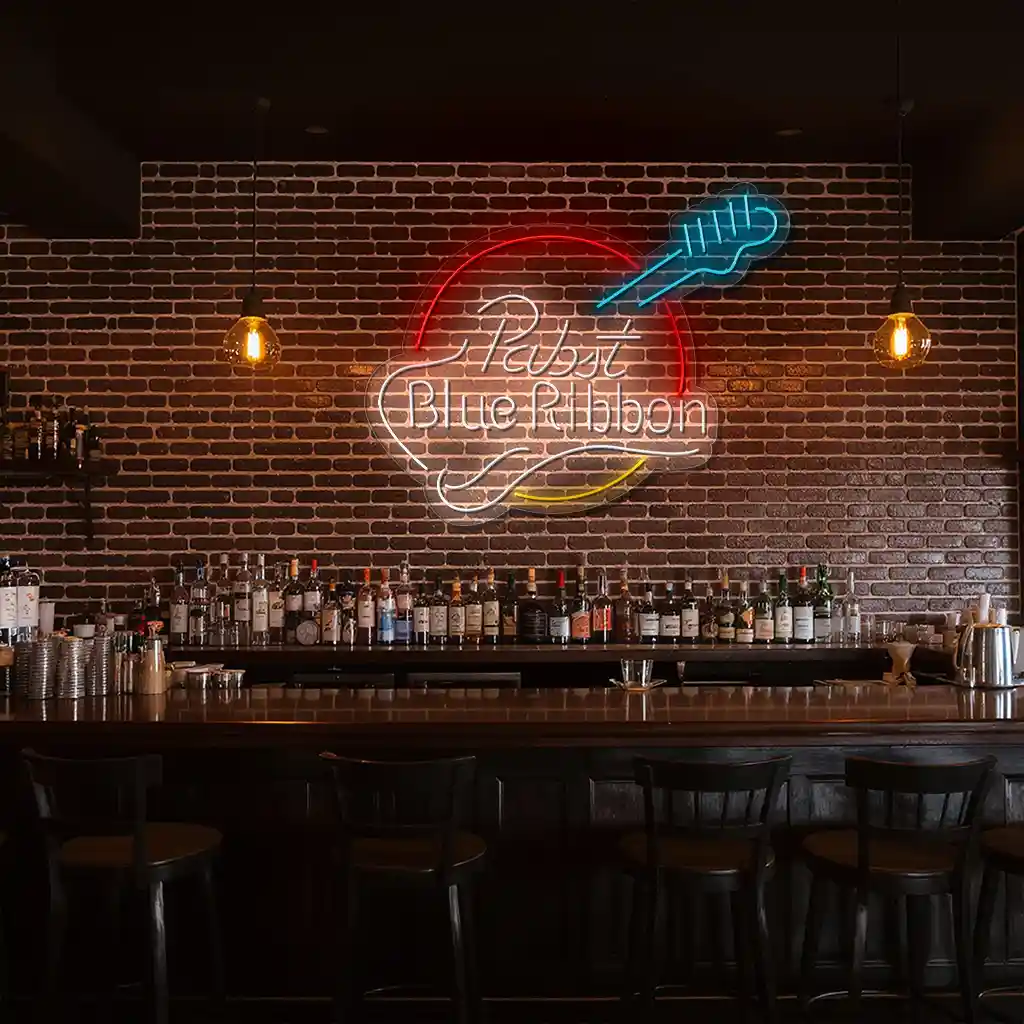 - Classic Color Harmony: The sign expertly uses the signature Pabst Blue Ribbon color palette—deep blues, bright reds, and crisp whites—to create a vibrant visual impact. These colors are perfectly balanced to evoke nostalgia while ensuring maximum visibility and appeal in low-light environments.