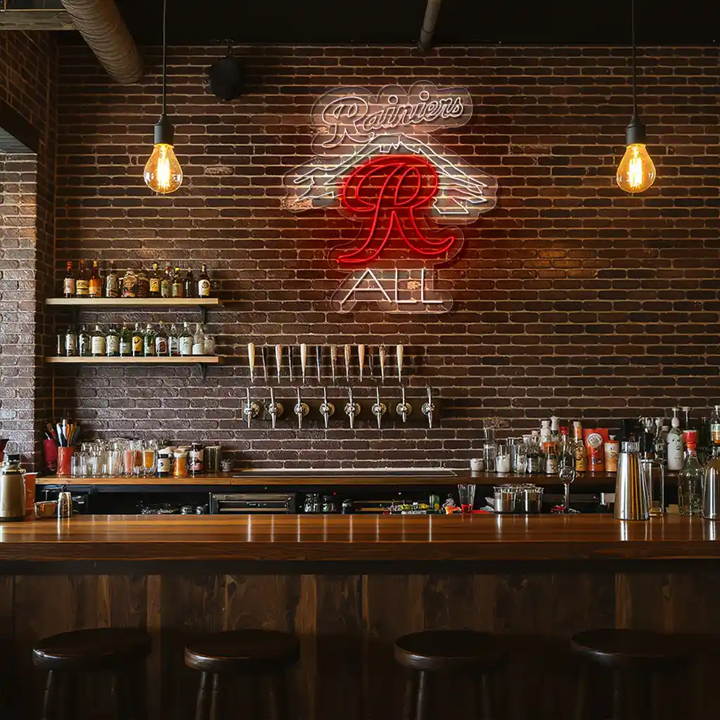 Neon Sign Design: Vintage Rainier Beer Logo on Brick Wall