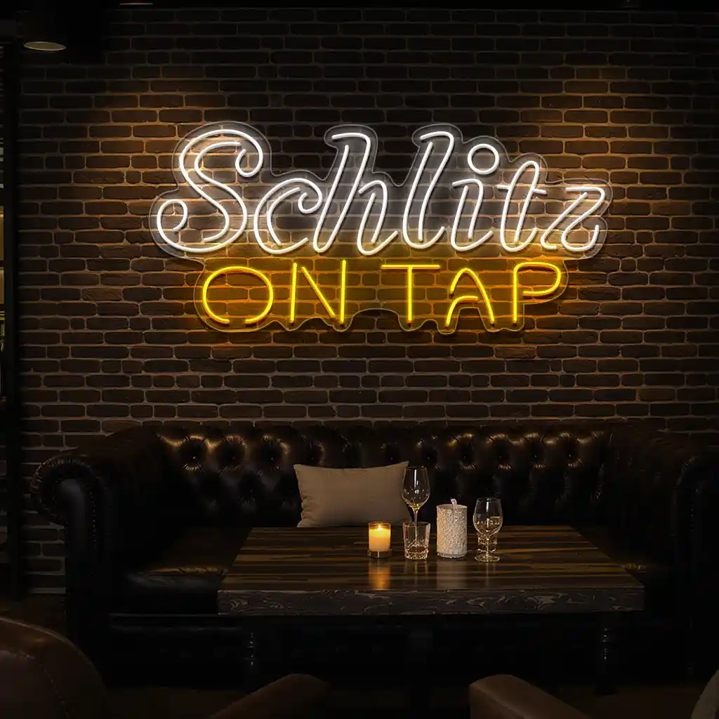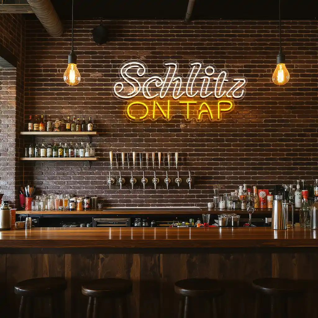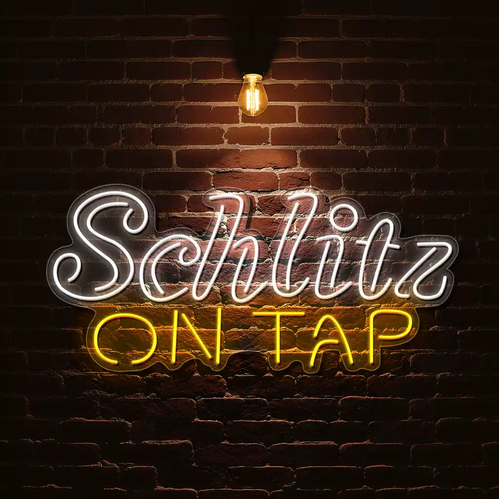 - Vibrant Color Coordination: Featuring warm red and subtle amber hues intertwined with cool white neon, the sign creates a balanced visual appeal. The red outlines the iconic Schlitz logo, while amber highlights the “On Tap” text, symbolizing the warmth of a freshly poured beer, making the sign both eye-catching and inviting.