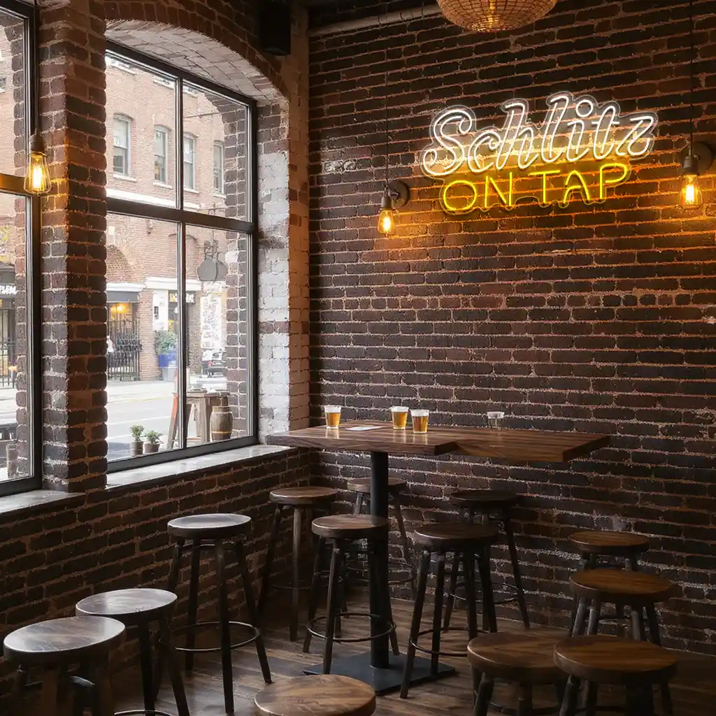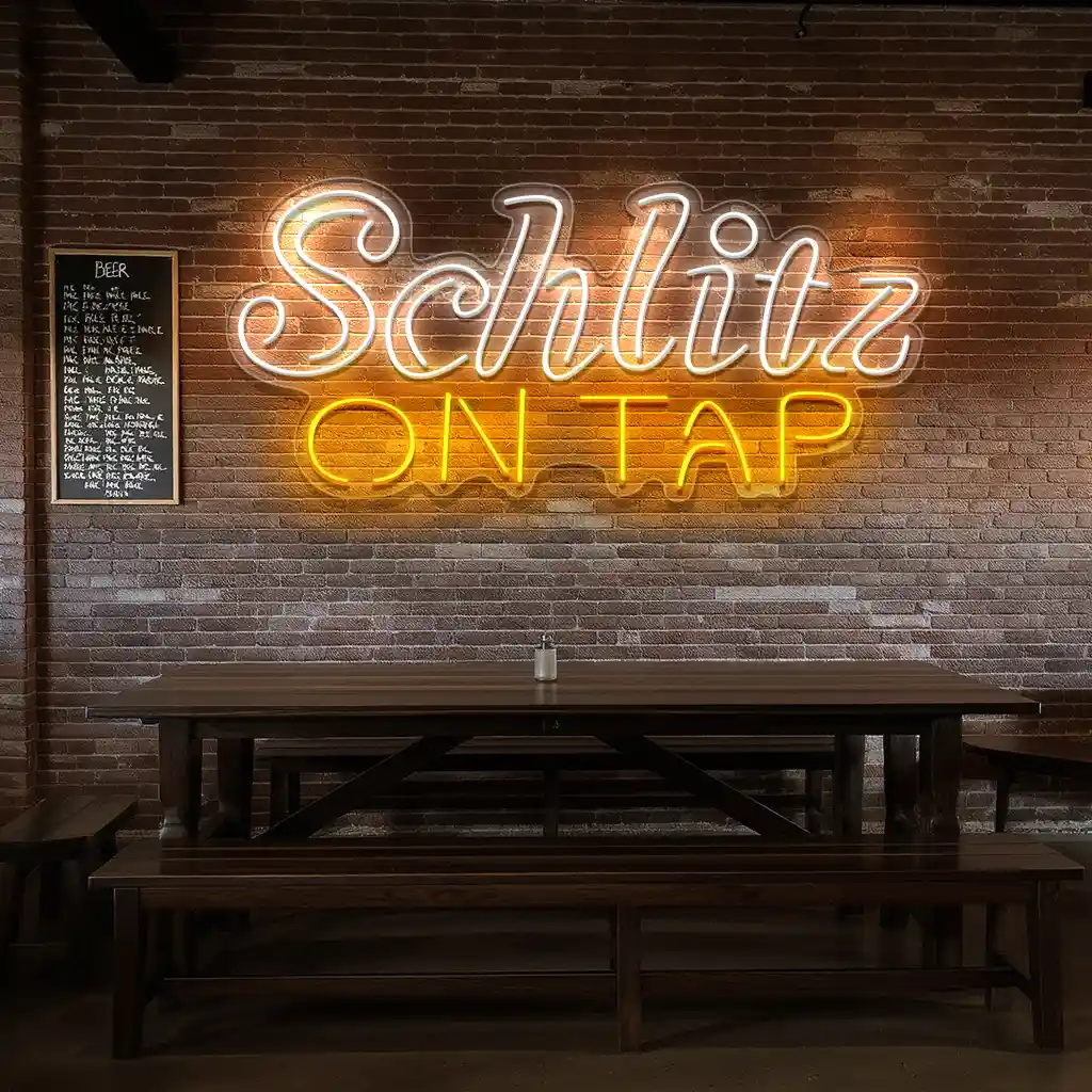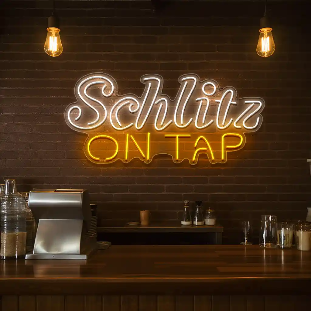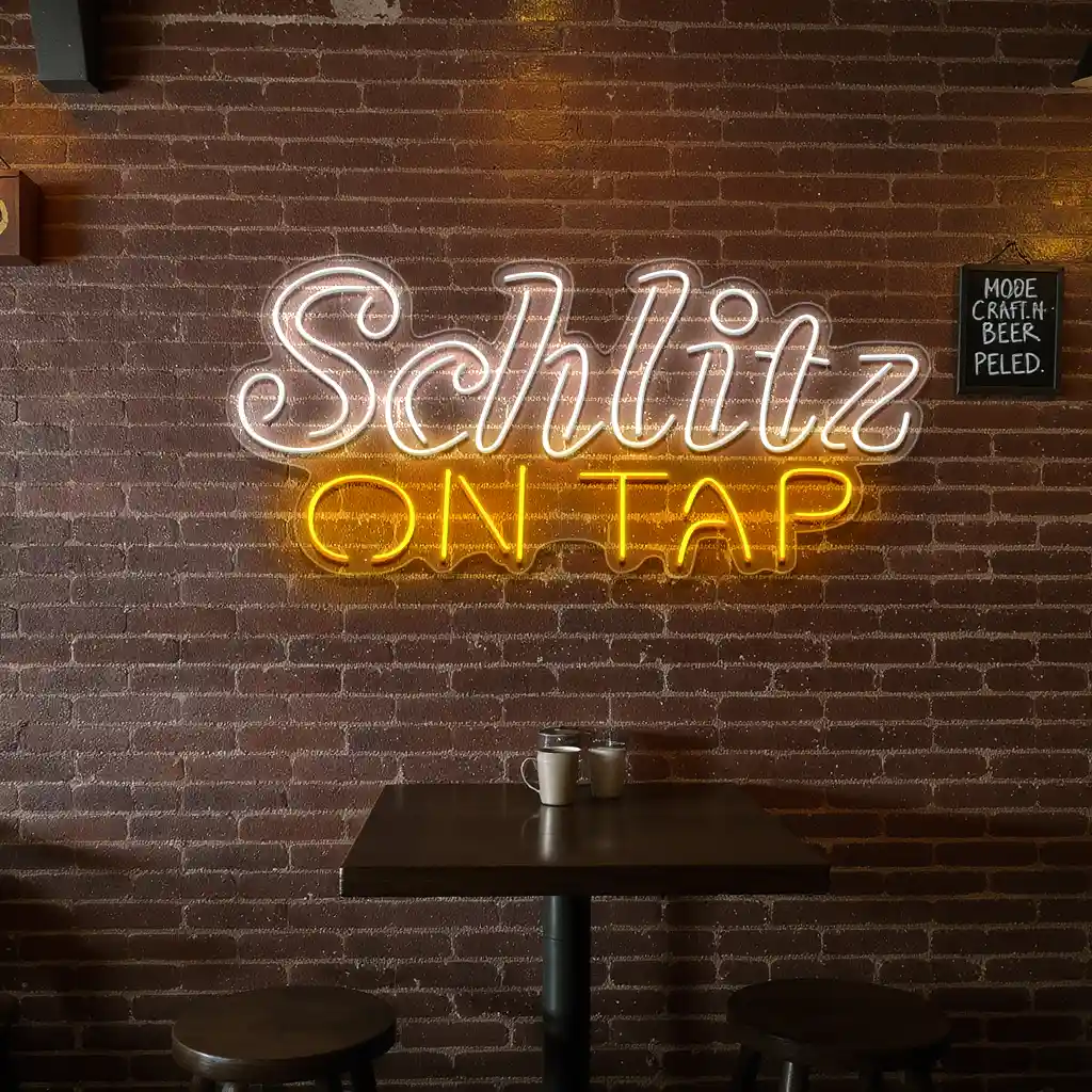 - Vibrant Color Coordination: Featuring warm red and subtle amber hues intertwined with cool white neon, the sign creates a balanced visual appeal. The red outlines the iconic Schlitz logo, while amber highlights the “On Tap” text, symbolizing the warmth of a freshly poured beer, making the sign both eye-catching and inviting.
