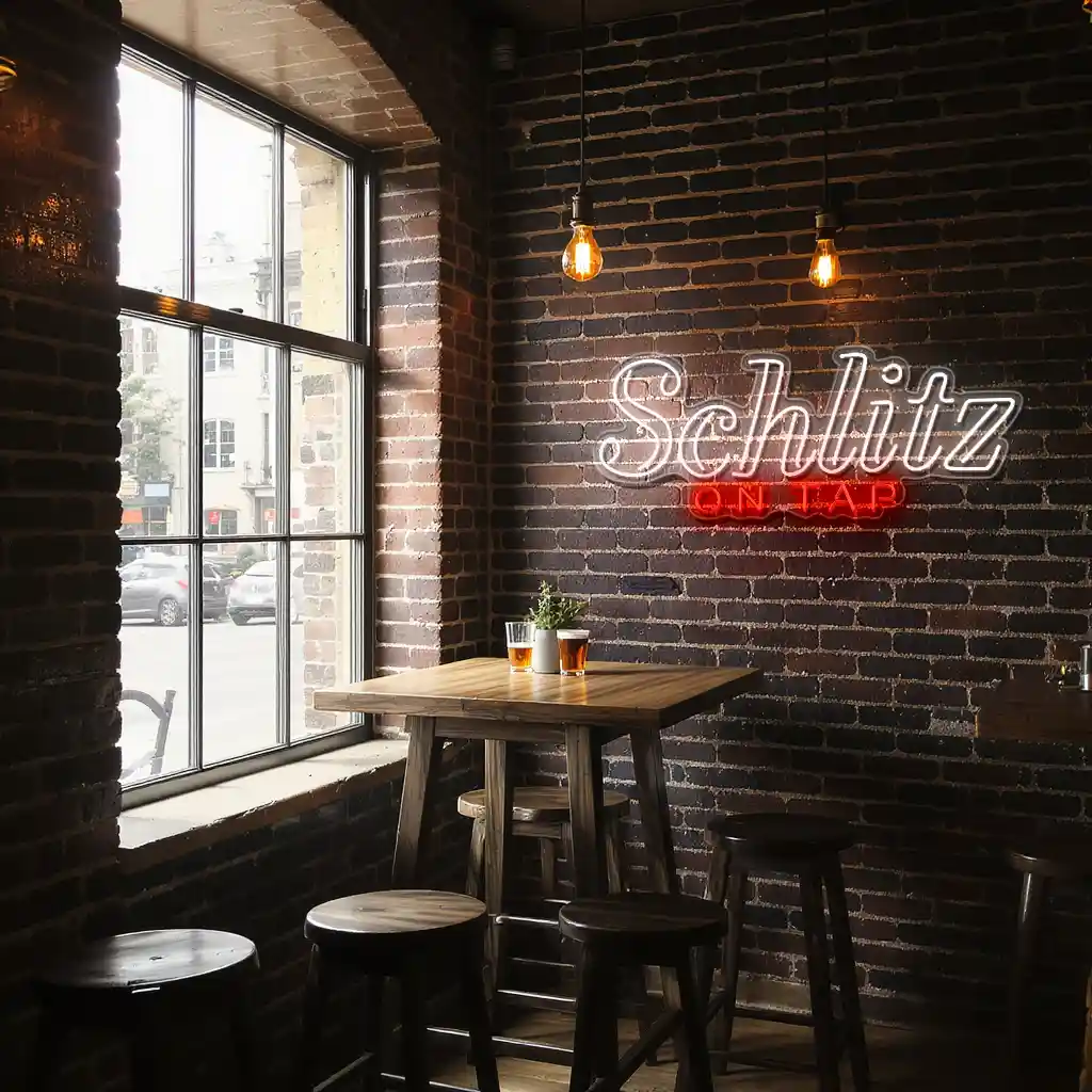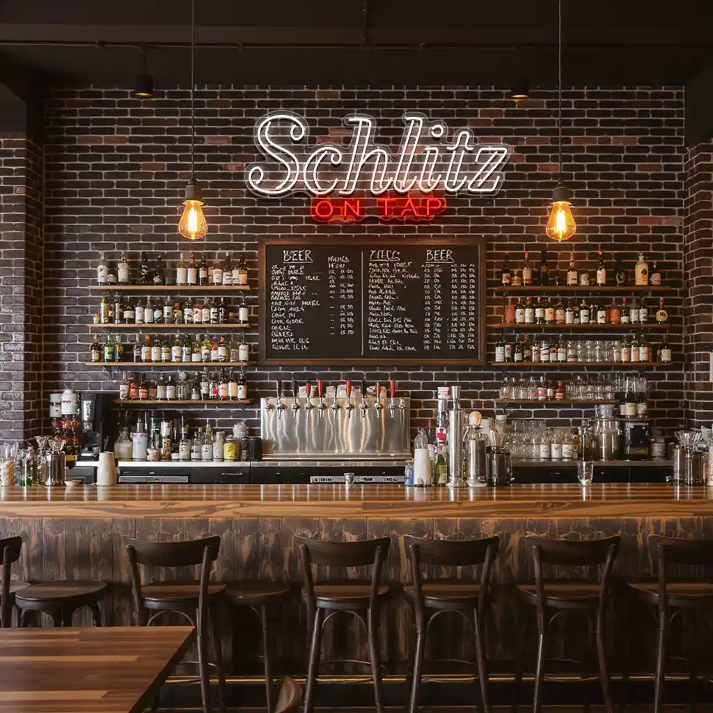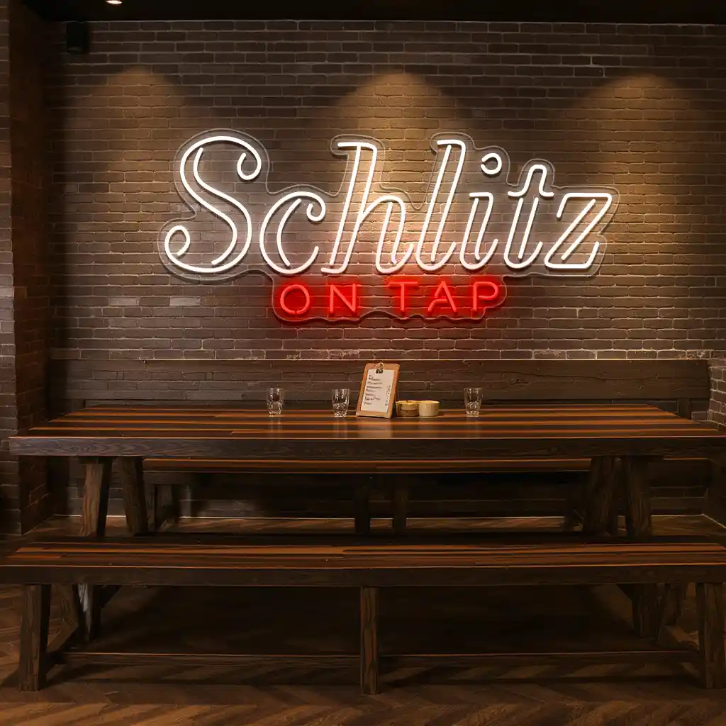• Classic Color Coordination: The sign uses a rich blend of warm amber and bright red neon lights that perfectly mirror the traditional Schlitz branding. This thoughtful color pairing creates a welcoming ambiance while drawing attention to its retro charm. Explore more designs at Schlitz Beer Neon Signs.