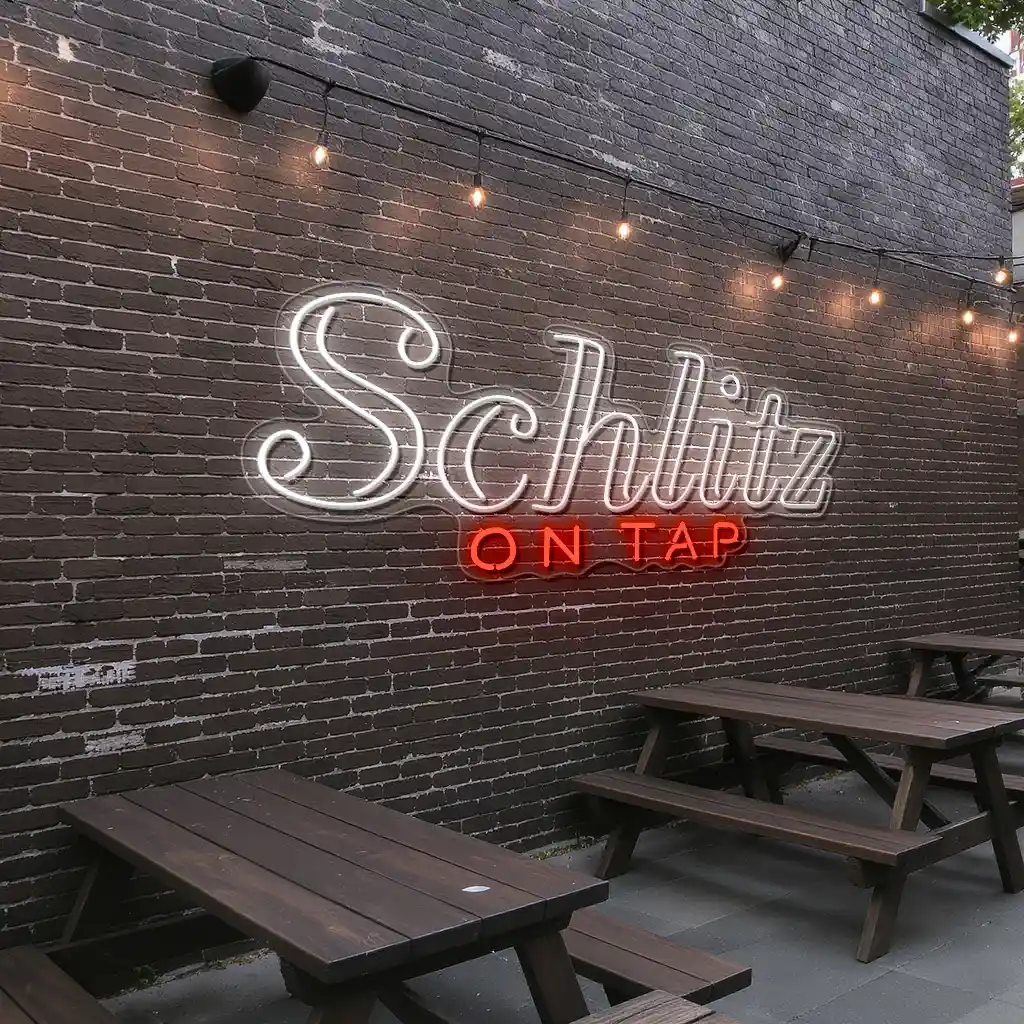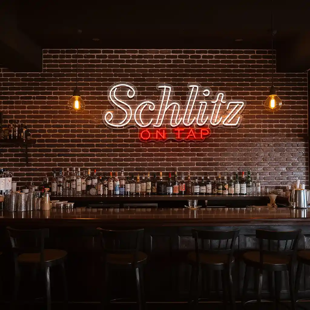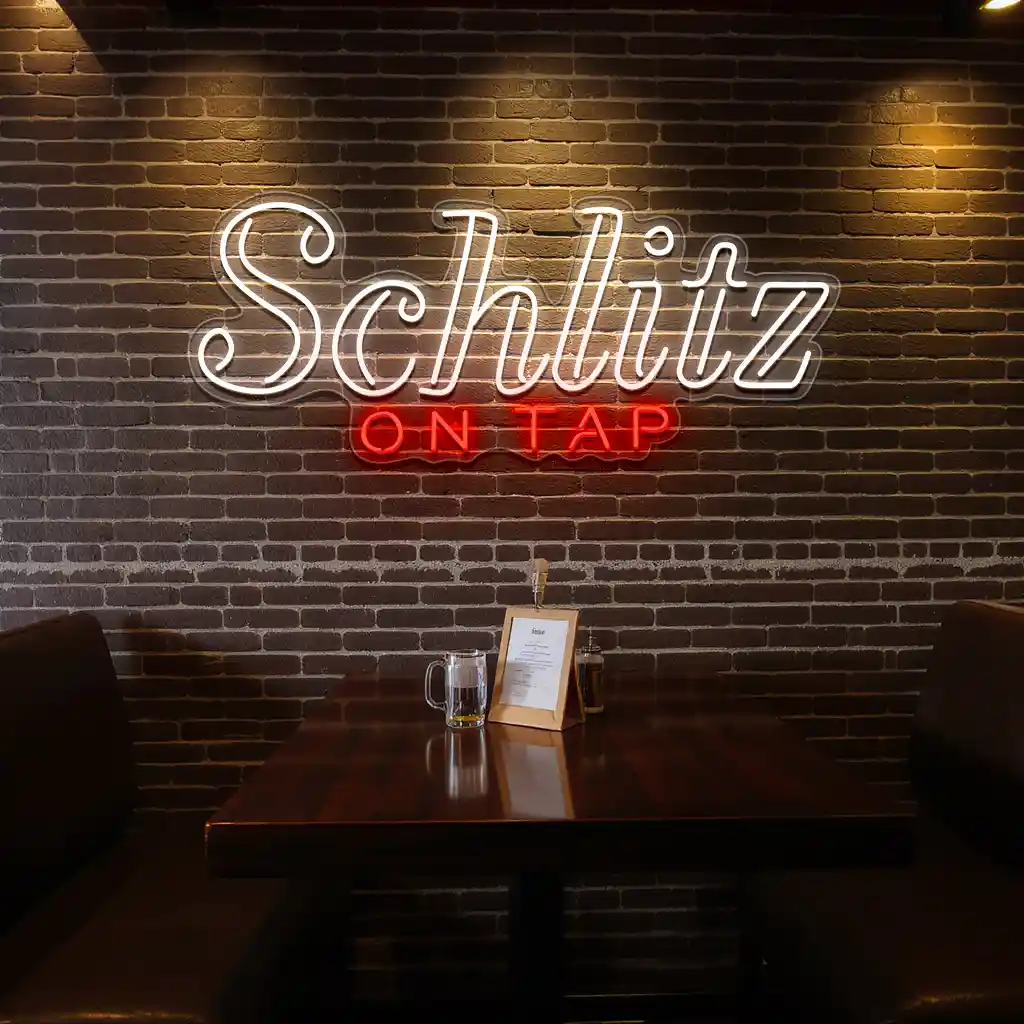 • Classic Color Coordination: The sign uses a rich blend of warm amber and bright red neon lights that perfectly mirror the traditional Schlitz branding. This thoughtful color pairing creates a welcoming ambiance while drawing attention to its retro charm. Explore more designs at Schlitz Beer Neon Signs.